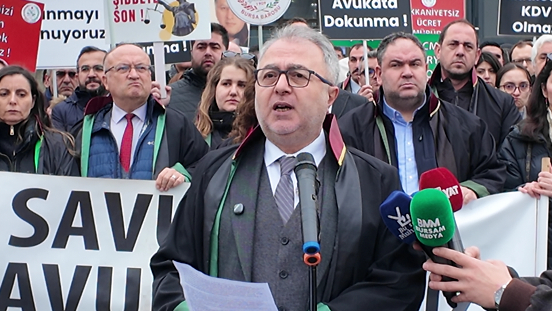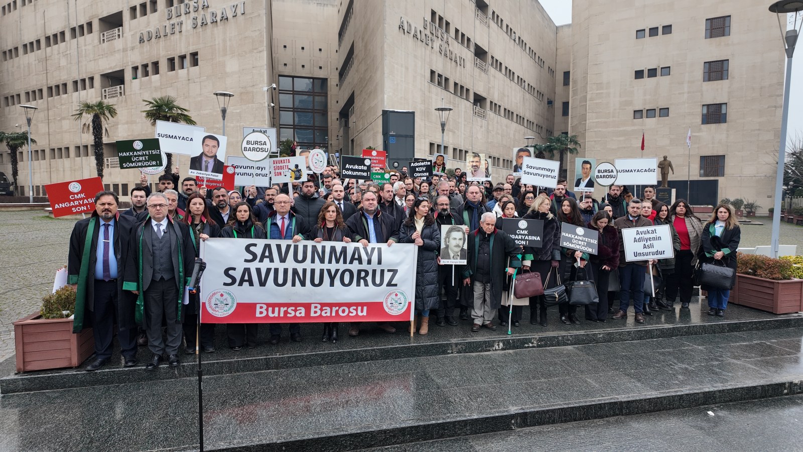 Bursa Barosu, başkan ve kurul üyeleriyle birlikte çok sayıda avukat, Bursa Adalet Sarayı önünde, avukatlara yönelik fiziki saldırılara ve özellikle genç avukatları açlığa mahkum eden düşük CMK ücret tarifesine tepki gösterdi.
