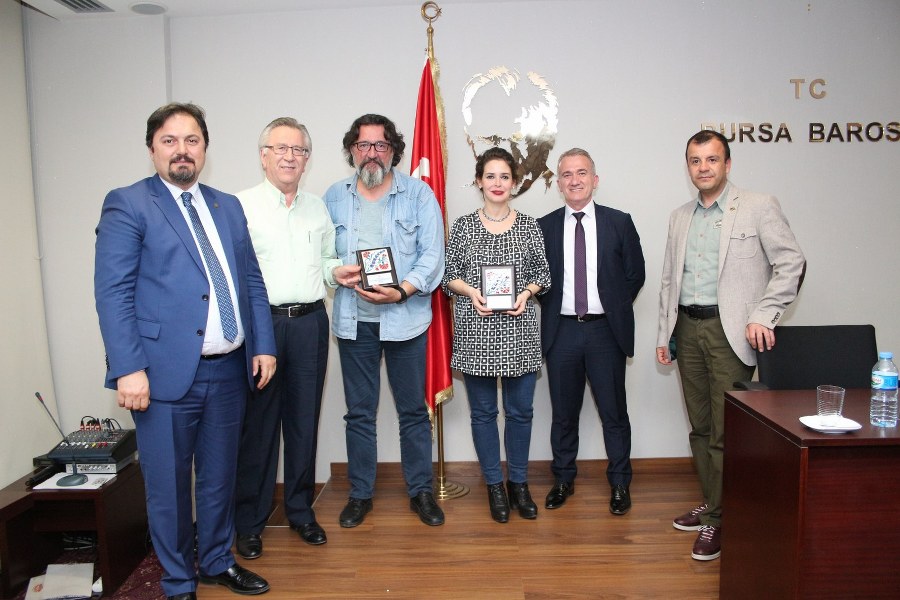 Söyleşinin sonunda, Bursa Barosu Başkanı Av. Gürkan Altun, önceki başkanlardan Av. Ali Arabacı, ÇGD Bursa Şubesi Başkanı Aykut Güngör, Pelin Batu ve Renan Bilek'e anı plaketi verdiler.