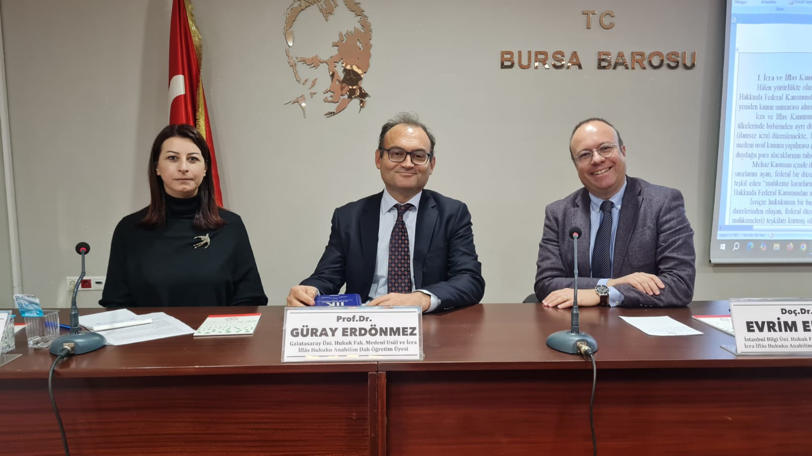 Bursa Barosu Eğitim Merkezi'nin (BUBEM) katkılarıyla düzenlenen, “Cebri İcra Kanunu Taslağında Öngörülen Değişiklik ve Yeniliklerin Değerlendirilmesi” başlıklı konferans BAOB Av.Özgür Aksoy Konferans Salonu'nda gerçekleştirildi. Galatasaray Üniversitesi Hukuk Fakültesi Medeni Usul ve İcra-İflas Hukuku ABD Öğretim Üyesi Prof. Dr. Güray Erdönmez ve İstanbul Bilgi Üniversitesi Hukuk Fakültesi Medeni Usul ve İcra-İflas Hukuku ABD Öğretim Üyesi Doç. Dr. Evrim Erişir'in konuşmacı olduğu konferansın moderatörlüğünü Bursa Barosu Saymanı Av. Nilay Parlar yaptı. Konferansı izleyen Bursa Barosu Başkanı Av. Metin Öztosun konuk konuşmacılara anı plaketi verdi.