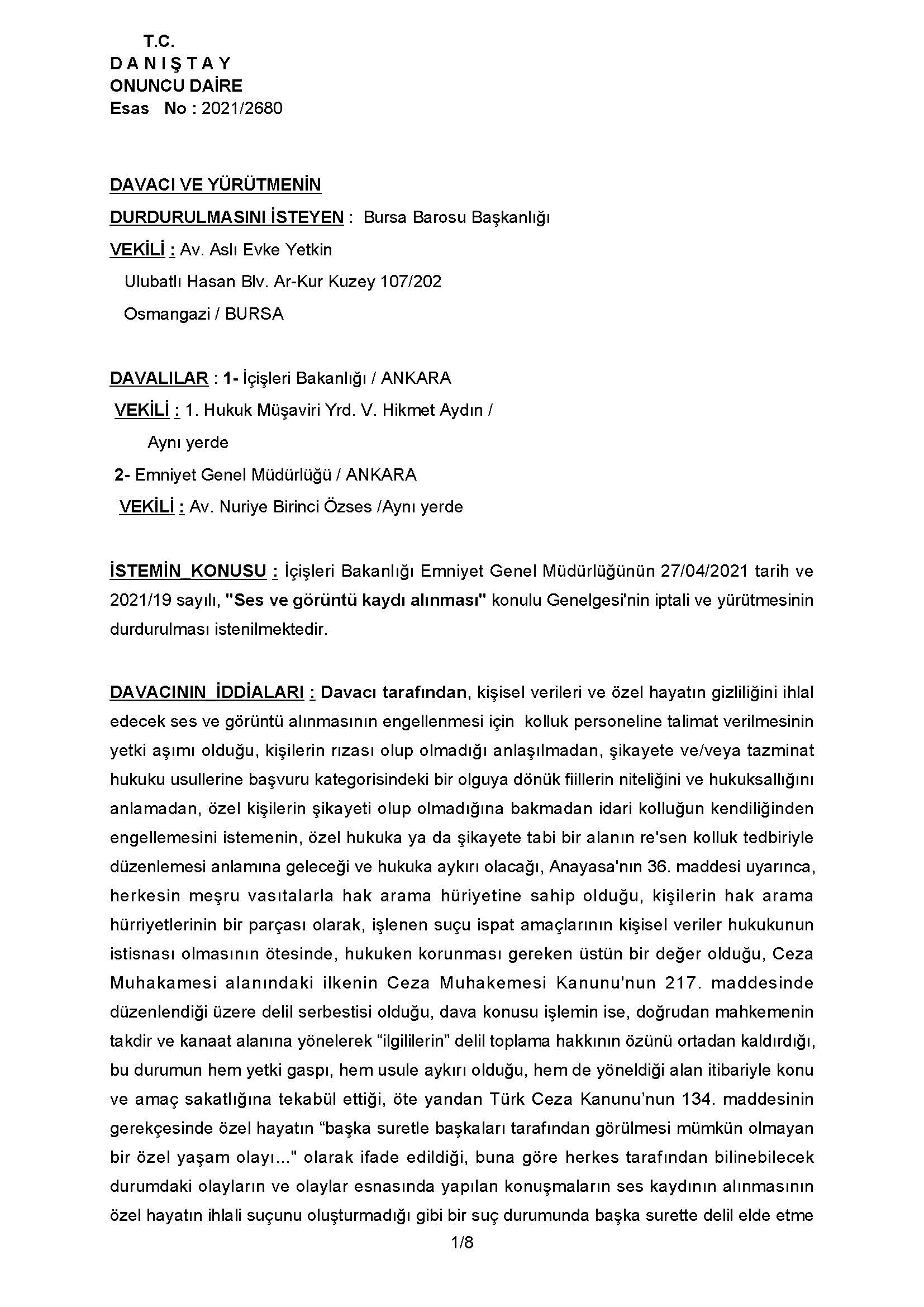 Bursa Barosu adına Bursa Barosu Genel Sekreteri Av.Aslı Evke Yetkin tarafından İçişleri Bakanlığı Emniyet Genel Müdürlüğü'nün, toplumsal olaylarda polislerin davranışlarına ilişkin, vatandaşlarca ses ve görüntü alınmasının engellenmesi, şartlar oluştuğunda da adli işlem yapılması talimatı veren genelgesinin yürütmesinin durdurulması ve iptali istemiyle açılan davada Danıştay 10. Dairesi yürütmenin durdurulmasına karar verdi.