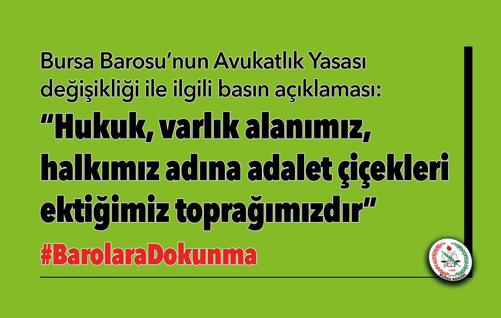 Bizler avukatlığı sadece bir iş olarak görmüyor ve mesleğimizi kutsal bir görev gibi ifa ediyoruz. Adliye koridorlarında, duruşmalarda, sorgularda, ifade odalarında adalet, hak ve hukukun üstünlüğü peşinde ter döküyoruz. Bu uğurda Cengiz Göral'ı, A. Hilmi Feyzioğlu'nu ve Özgür Aksoy'u şehit veren, Kuvayı Milliye geleneğinden gelip TBMM kürsüsünden Puşide-i siyahı kaldıranların ruhunu taşıyan Bursa Barosu avukatları olarak bizler, her ahval ve şartta hukukun üstünlüğü bayrağını taşımaya, Gazi Mustafa Kemal Atatürk'ün dediği gibi “Hak kuvvetten üstündür” demeye devam edeceğiz.