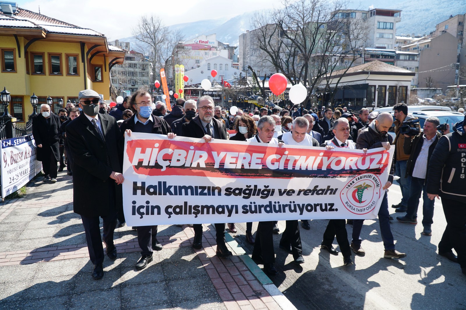 Bursa Barosu Başkanı Av. Metin Öztosun, Başkan Yardımcısı Av. Aslı Evke Yetkin, Sayman Av. Gonca Gülçin, yönetim kurulu üyeleri Av. Özge Türker Yılmaz ve Av. Yasemin Reçber ile Sağlık Hukuku Komisyonu Başkanı Av. Nilüfer Aydın'ın katıldığı yürüyüş öncesi Bursa Tabip Odası Başkanı Doç. Dr. Alpaslan Türkkan “Bizleri mutsuz, hastaları mağdur eden; sağlığı ticarete, hastaları müşteriye, hastaneleri ticarethanelere dönüştüren sağlık anlayışı, Sağlıkta Dönüşüm Programı iflas etmiştir. Bizleri artık sağlık hizmeti veremez hale getiren bu çalışma koşullarının sürdürülemez olduğunu bir kez daha ifade ediyoruz. Emeğimizin karşılığını alamadan her geçen gün umutsuzluğa sürüklenirken, tüm bu yaşadıklarımızın sorumlusunun yıllardır uygulanan yanlış sağlık politikaları olduğunu biliyoruz. Emeğimizin karşılığını alamadığımız bu çalışma koşullarına, sağlık alanında yaşanan şiddete artık tek bir gün bile tahammülümüz kalmadı. Oyalama istemiyoruz, Daha fazlasını değil, yalnızca hakkımız olanı istiyoruz” dedi.