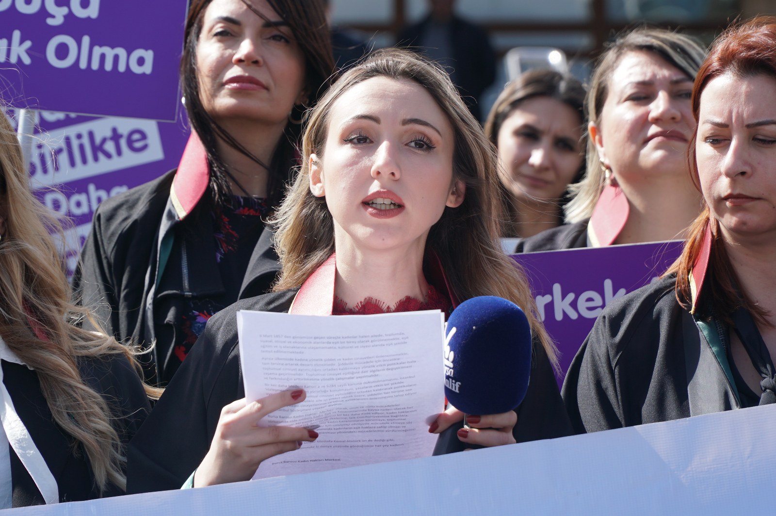 Bursa Barosu Kadın Hakları Merkezi Başkanı Av. Büşra Pınar Altınoluk, 8 Mart Dünya Emekçi Kadınlar Günü'nün kutlama günü olmadığını belirterek “Uzun ve zorlu mücadeleler sonucunda elde edilmiş kadın hak ve kazanımlarında kayba neden olacak her türlü girişimin karşısında olacağımızı bir kez daha ifade ediyor, toplumsal cinsiyet eşitliğinin sağlanması için cinsiyetçi zihniyetle mücadele etmeye söz veriyoruz” dedi.