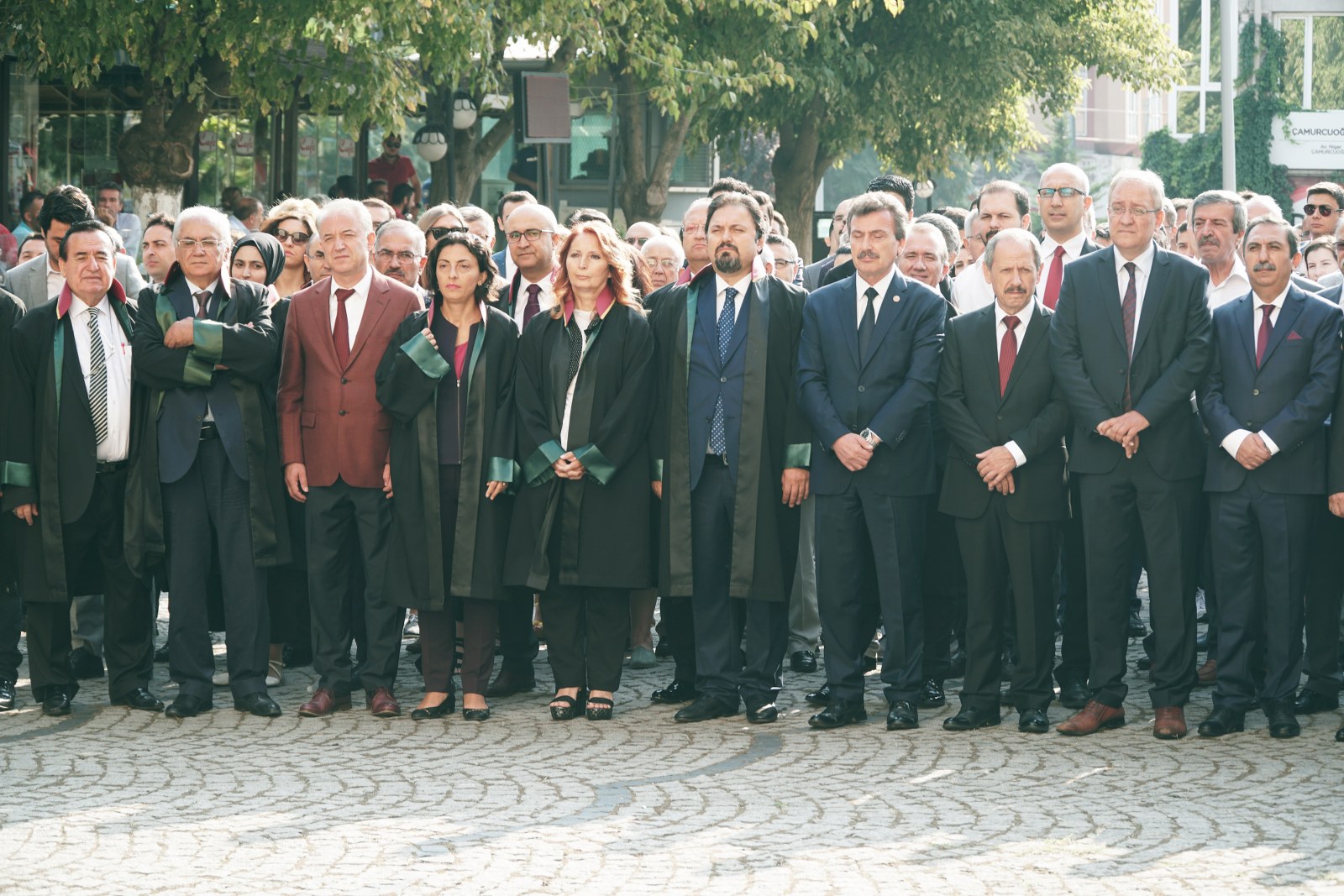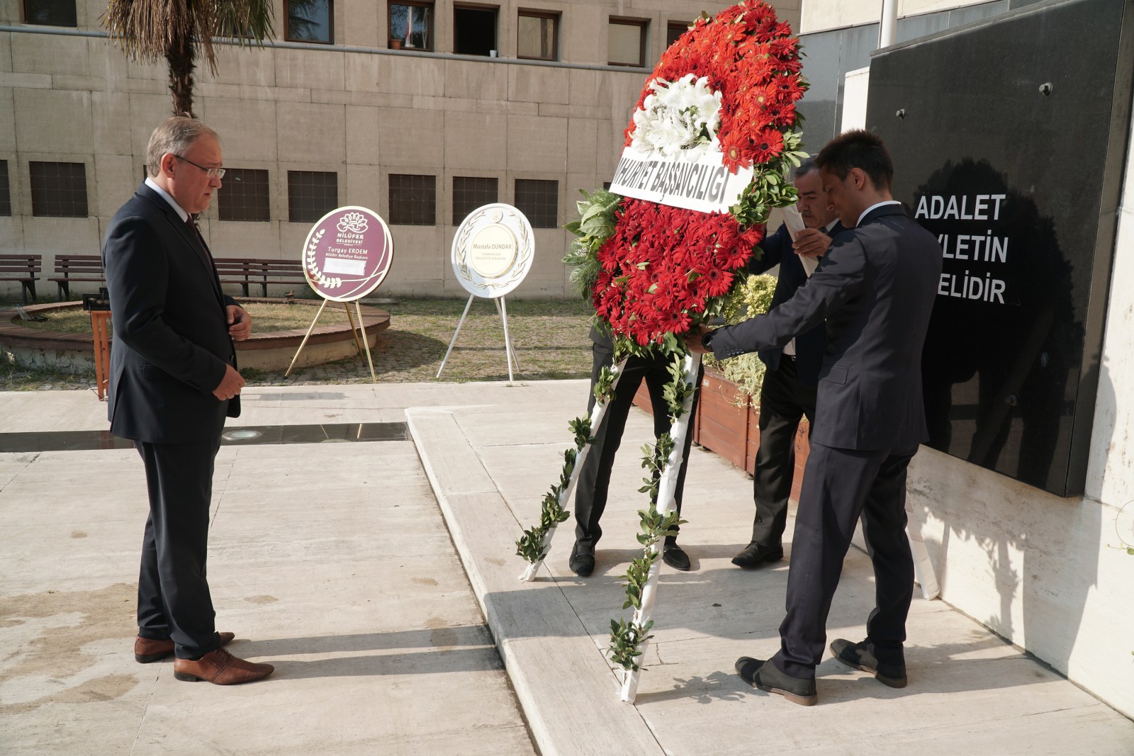 Bursa Adalet Sarayı bahçesinde Atatürk Anıtı önünde düzenlenen törene, Bursa Valisi Yakub Canpolat, Bursa Büyükşehir Belediye Başkanvekili Süleyman Çelik, Bursa Cumhuriyet Başsavcı Vekili Gökhan Şen, Adli Yargı Adalet Komisyonu Başkanı Ali Rıza Bir, Bölge Adliye Mahkemesi Başkanı Abdülkadir Şahin, BAM Cumhuriyet Başsavcısı Sadık Bölek, Türkiye Barolar Birliği Yönetim Kurulu Üyesi Av. Asude Şenol, Bursa Milletvekilleri Atilla Ödünç, Av. Nurhayat Altaca Kayışoğlu, Prof. Dr. Yüksel Özkan, İl Jandarma Komutanı Tuğgeneral Hakan Saraç, ilçe belediye başkanları, sivil toplum örgütü başkan ve temsilcileri, Bursa Barosu kurul üyeleri ve avukatlar ile adliye personeli katıldı.
