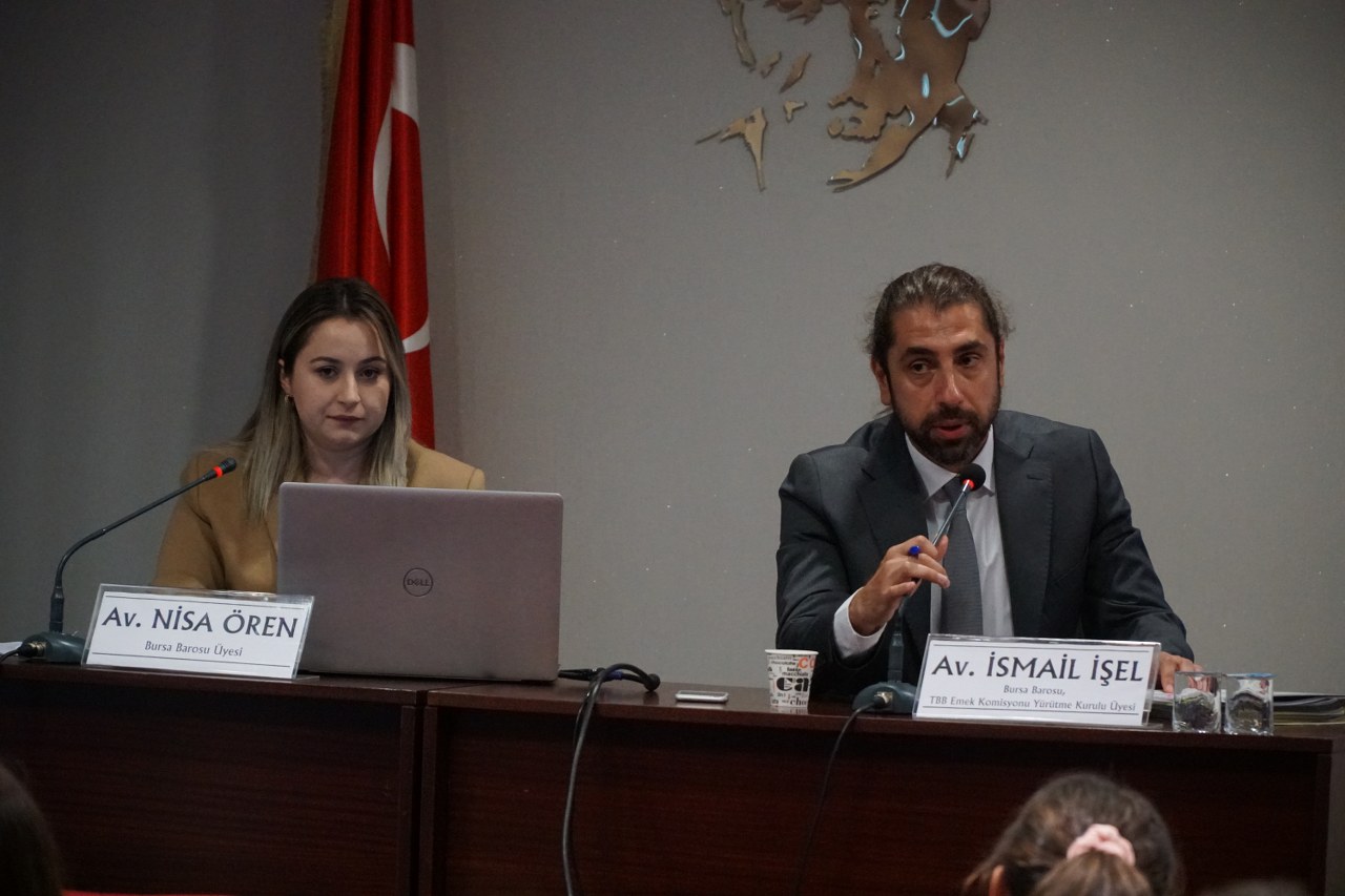 Bursa Barosu Eğitim Merkezi BUBEM tarafından “Emek Haftası Etkinlikleri” kapsamında düzenlenen “Anayasa Mahkemesi Bireysel Başvuru Kararlarının İş Hukukuna Etkileri” konulu seminer Av. Özgür Aksoy Konferans Salonu'nda gerçekleştirildi. Bursa Barosu Başkanı Av. Metin Öztosun ve yönetim kurulu üyeleriyle avukatların izlediği seminerde, TBB Emek Komisyonu Yürütme Kurulu Üyesi Av. İsmail İşel ile Av. Nisa Ören bilgilendirme yaptı. Seminer sonunda Bursa Barosu Başkanı Metin Öztosun ve Başkan Yardımcısı Av. Aslı Evke Yetkin, İşel ve Ören'e anı plaketi verdi.