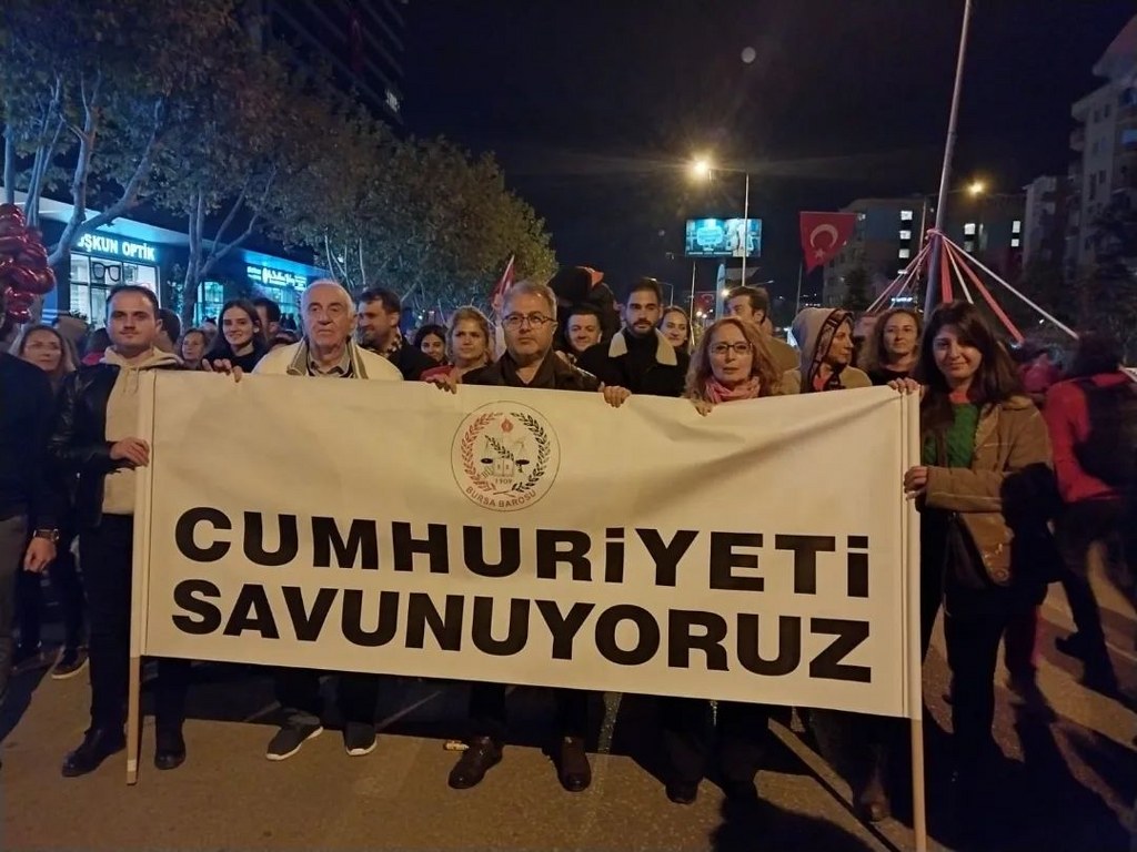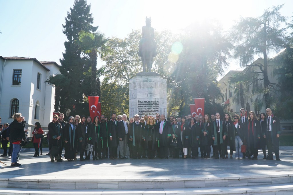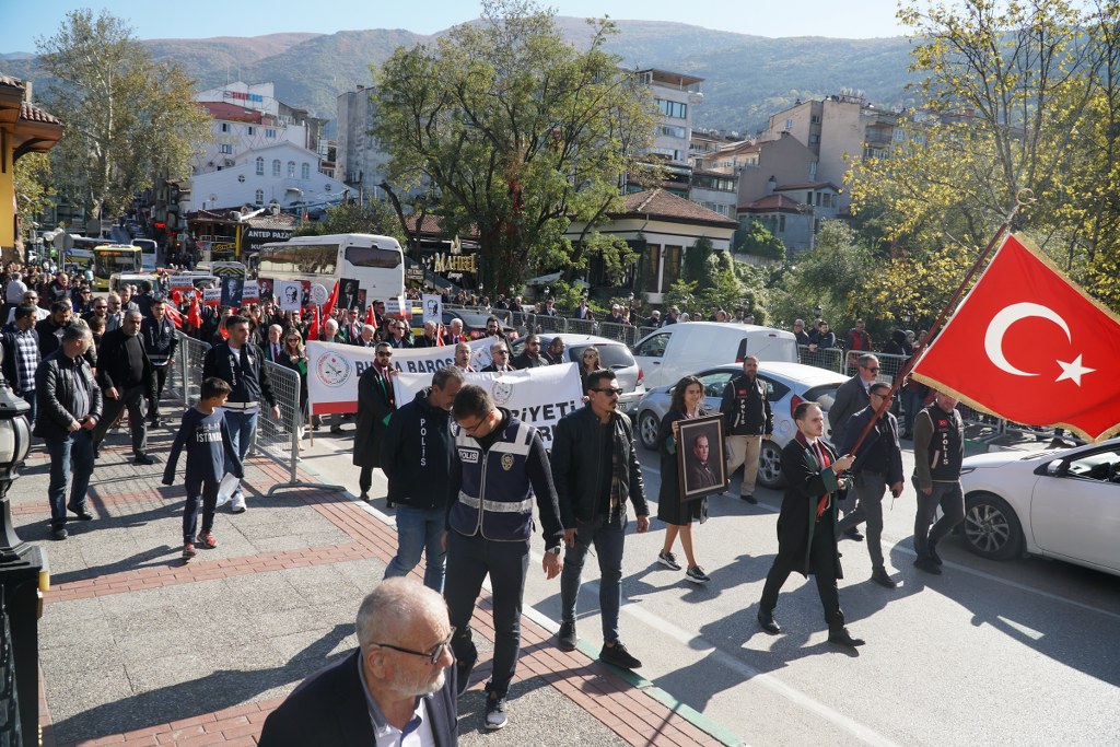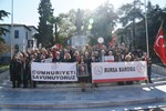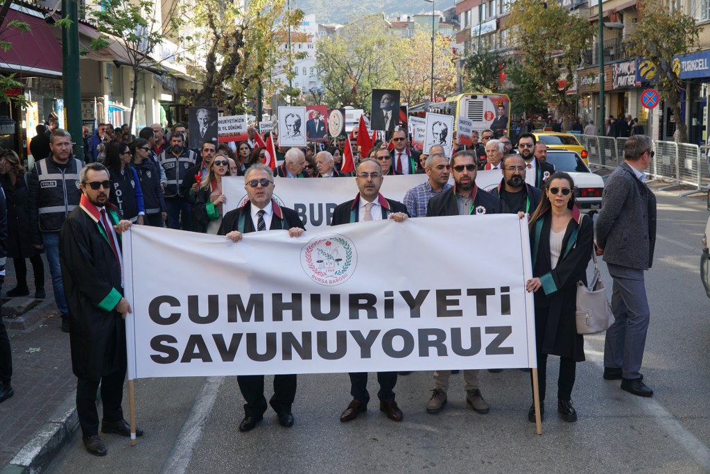 Bursa Barosu Başkanı Av. Metin Öztosun, önceki başkanlar Av. İsmail Acar, Av. Asude Şenol ile baro kurullarının üyeleri, YK genç temsilcileri ve avukatlar, "Cumhuriyeti Savunuyoruz" pankartı arkasında, marşlar ve sloganlar eşliğinde Atatürk Anıtı'na yürüdü. Yürüyüş sırasında vatandaşlar alkışlarıyla destek verdi. Öztosun'un, Atatürk Anıtı'na çelenk sunmasının ardından Türkiye Cumhuriyeti'nin kurucusu Mustafa Kemal Atatürk ve şehitler için saygı duruşunda bulunuldu, İstiklal Marşı okundu.