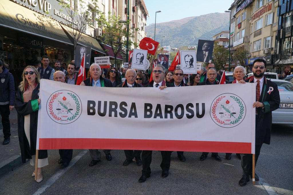 Bursa Barosu, Cumhuriyet'in 99. yıldönümü nedeniyle Setbaşı Mahfel önünden Cumhuriyet Alanı'ndaki Atatürk Anıtı'na kadar yürüyüş gerçekleştirdi.