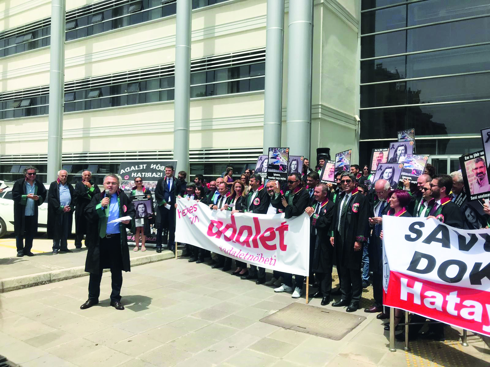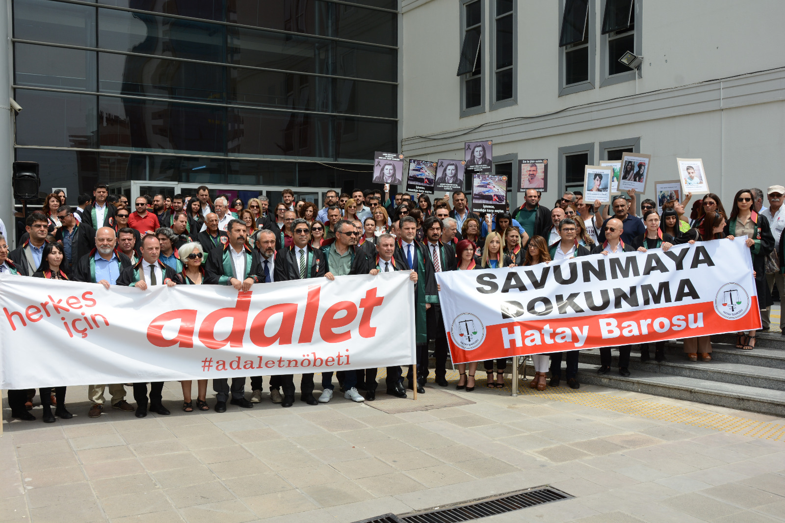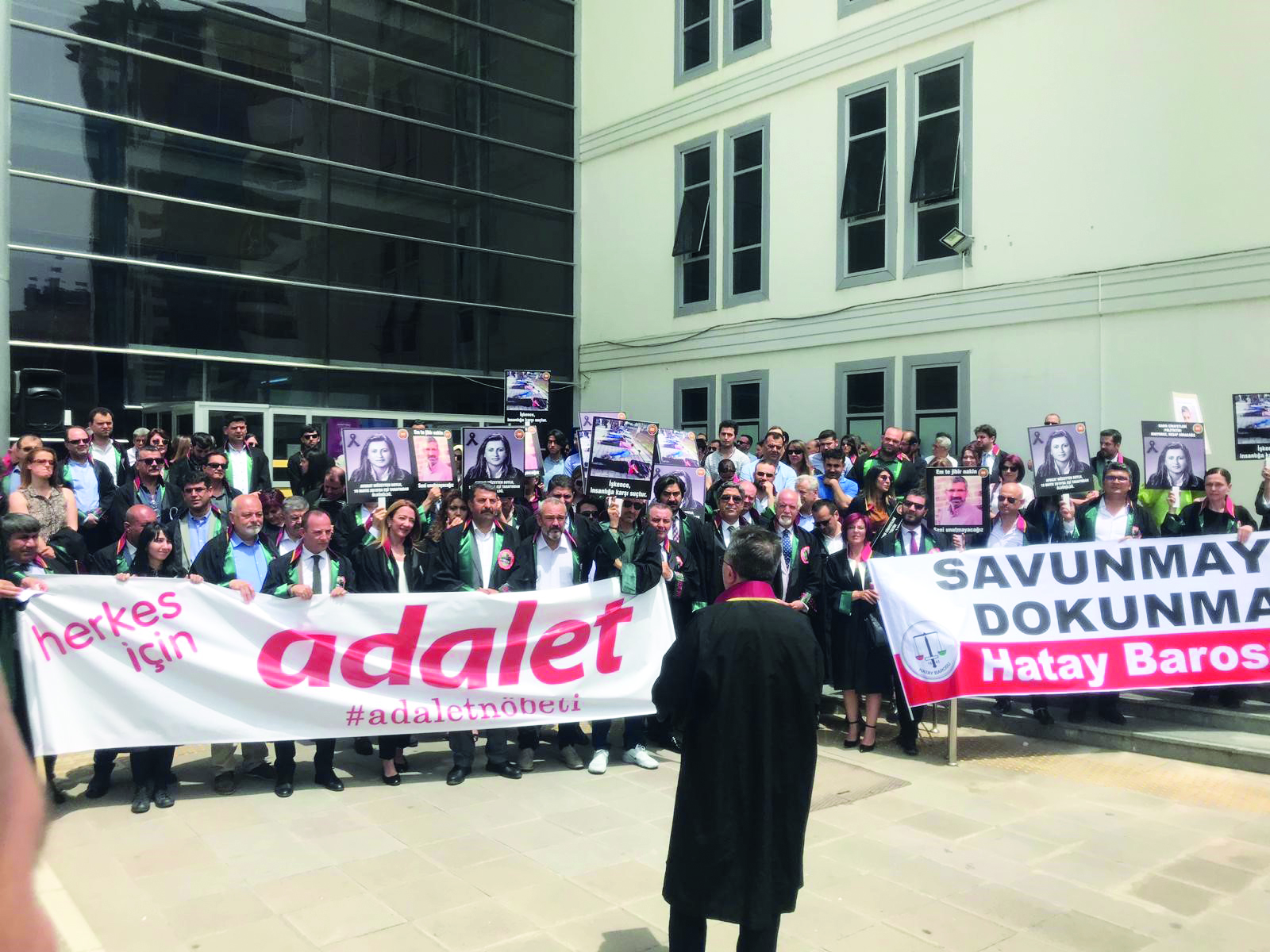 Adalet Nöbeti'nin Çoban Ateşi bu kez Hatay'da yandı. Bugün Hatay Barosu ev sahipliğinde Hatay Adalet Sarayı önünde tutulan nöbete, İstanbul, İzmir, Antalya, Aydın, Kocaeli, Yalova, Mersin, Gaziantep, Adana, Osmaniye, Diyarbakır baro başkanlarının yanı sıra Bursa Barosu Başkan Yardımcısı Av. Metin Öztosun katıldı. Öztosun'a Genç YK Temsilcileri Av. Ümit Özcan, Av. Müjde Kaya ve Av. Berkay Akkuş eşlik etti.