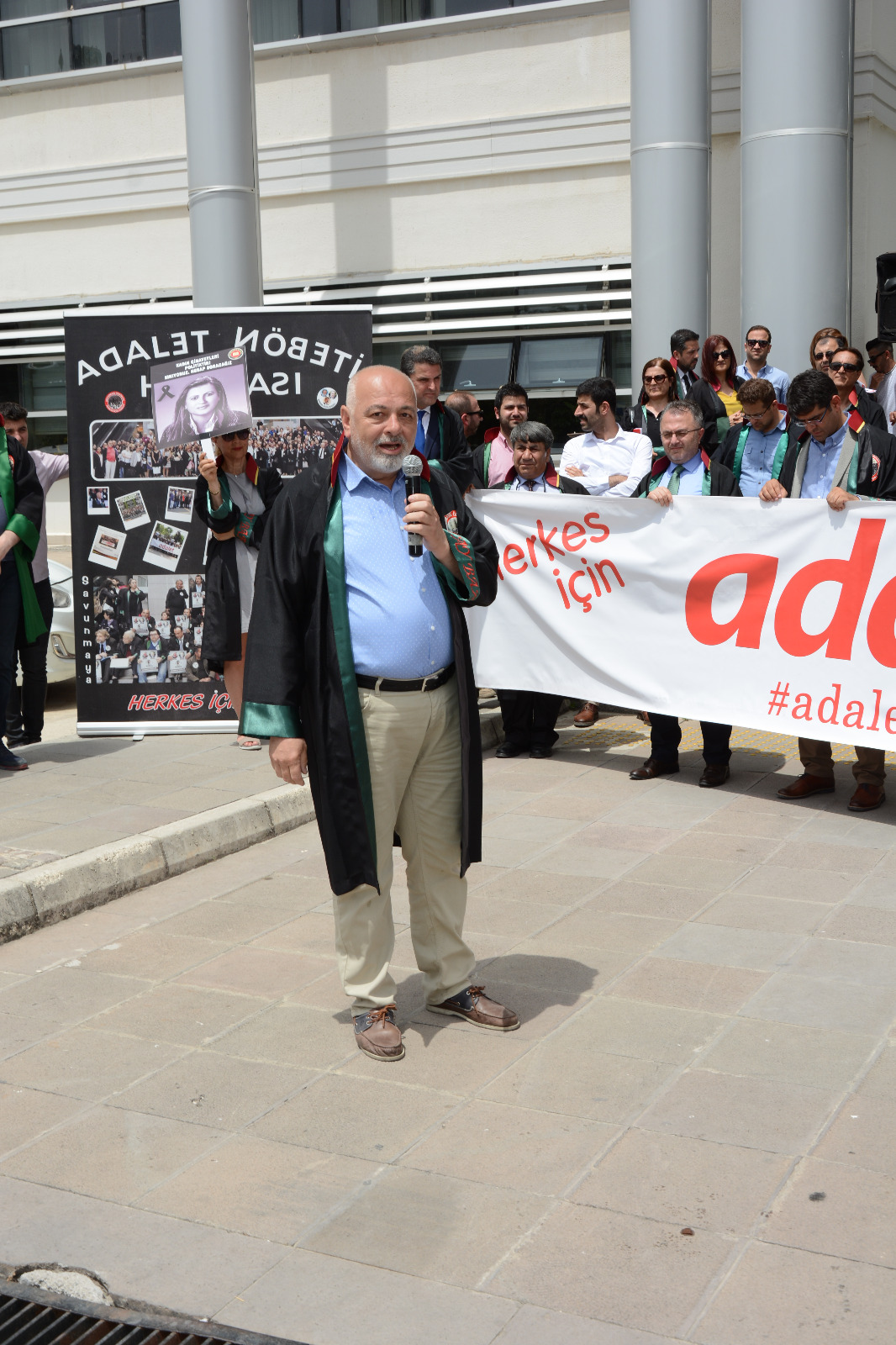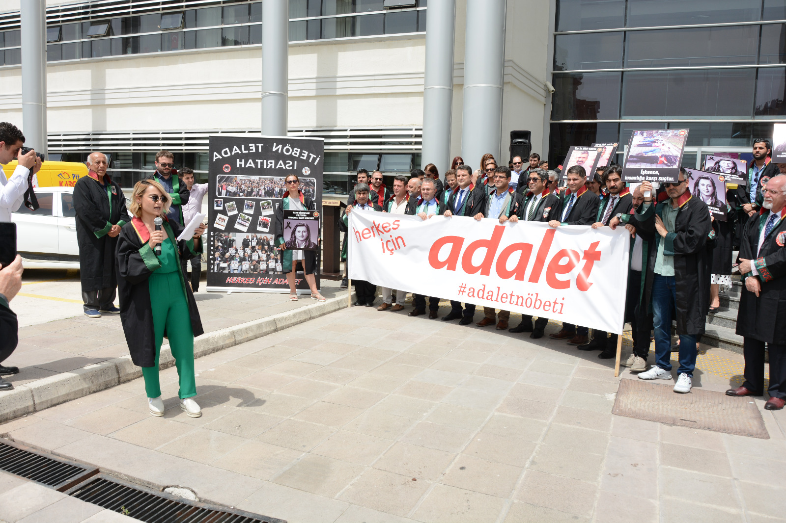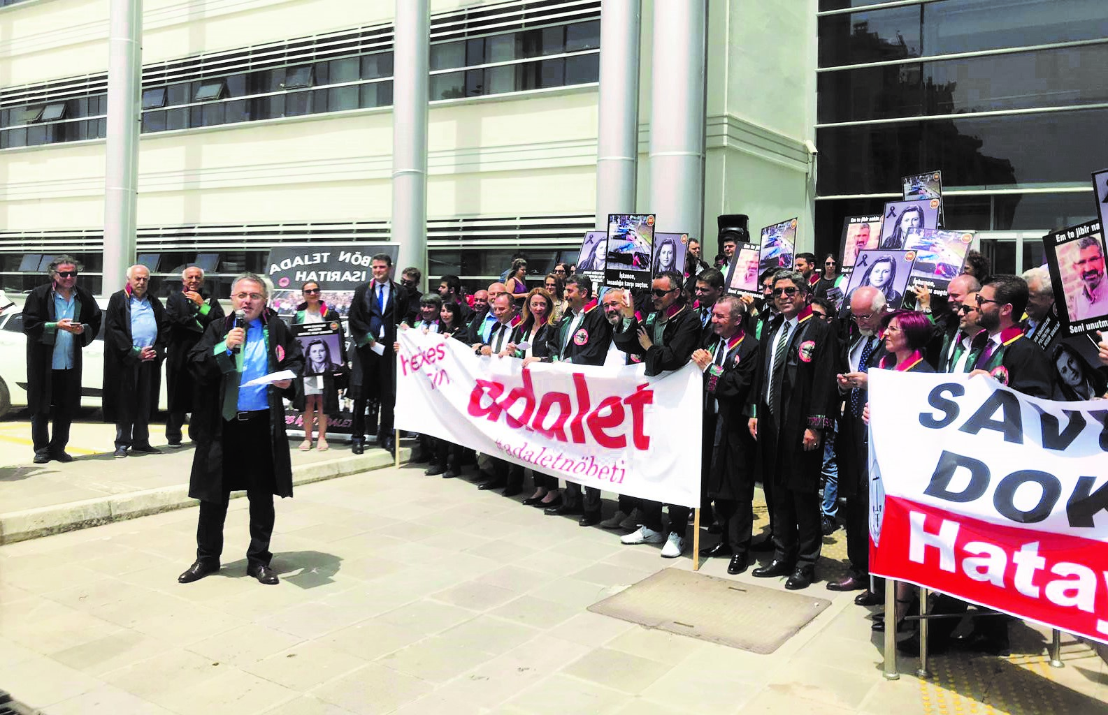 Adalet Nöbeti'nin Çoban Ateşi bu kez Hatay'da yandı. Bugün Hatay Barosu ev sahipliğinde Hatay Adalet Sarayı önünde tutulan nöbete, İstanbul, İzmir, Antalya, Aydın, Kocaeli, Yalova, Mersin, Gaziantep, Adana, Osmaniye, Diyarbakır baro başkanlarının yanı sıra Bursa Barosu Başkan Yardımcısı Av. Metin Öztosun katıldı. Öztosun'a Genç YK Temsilcileri Av. Ümit Özcan, Av. Müjde Kaya ve Av. Berkay Akkuş eşlik etti.