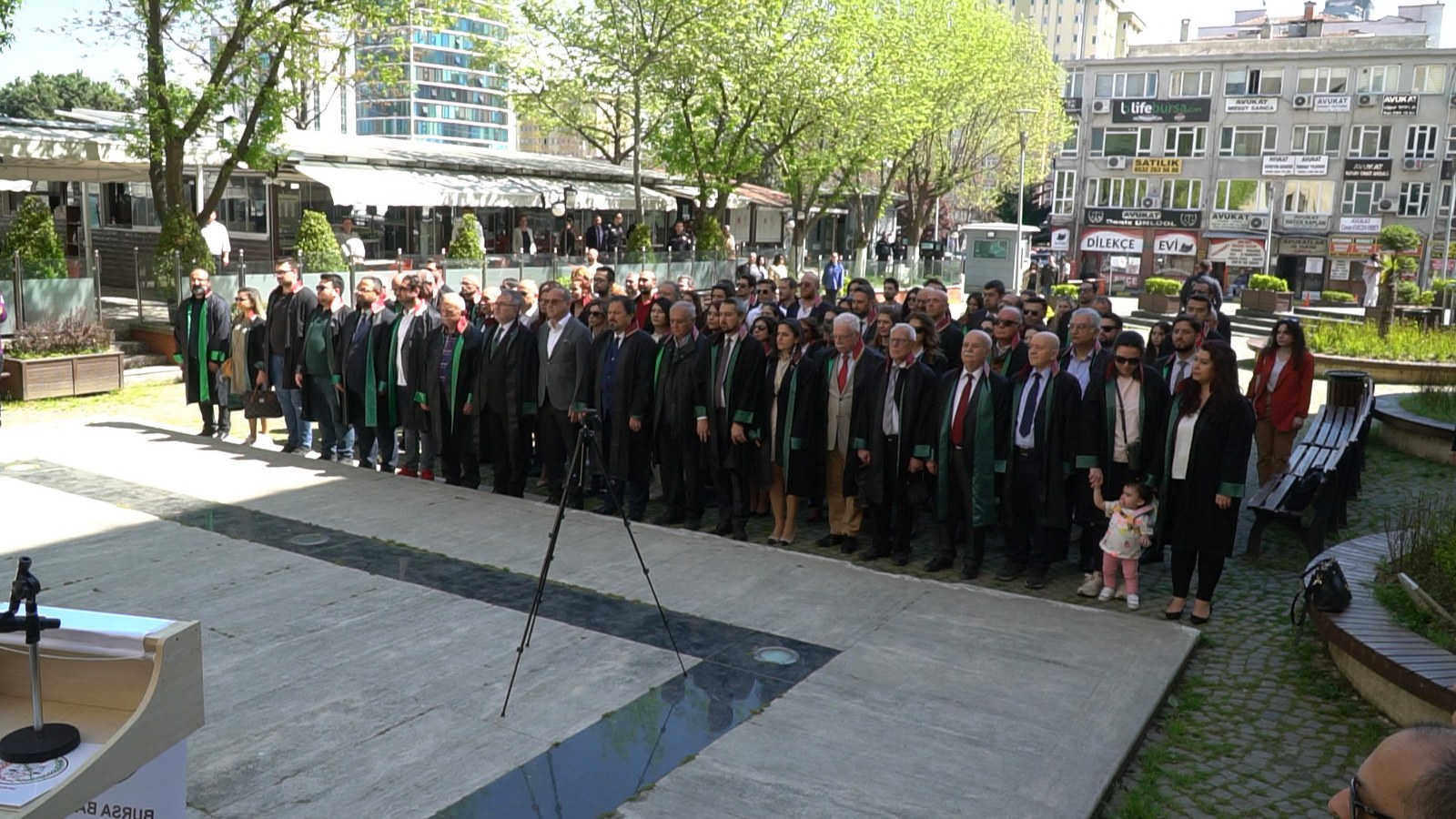 Törene Türkiye Barolar Birliği Başkan Yardımcısı Av. Gürkan Altun, Bursa Adli Yarı Adalet Komisyonu Başkanı Ömer Gülmüş, Bursa Barosu önceki başkanları Av. İsmail Acar, Av. Yahya Şimşek, Bursa Barosu kurullarının üyeleri ile avukatlar katıldı. Öztosun'un Atatürk Anıtı'na çelenk sunmasının ardından Bursa Büyükşehir Belediye Bandosu eşliğinde önce saygı duruşunda bulunuldu, ardından İstiklal Marşı okundu.