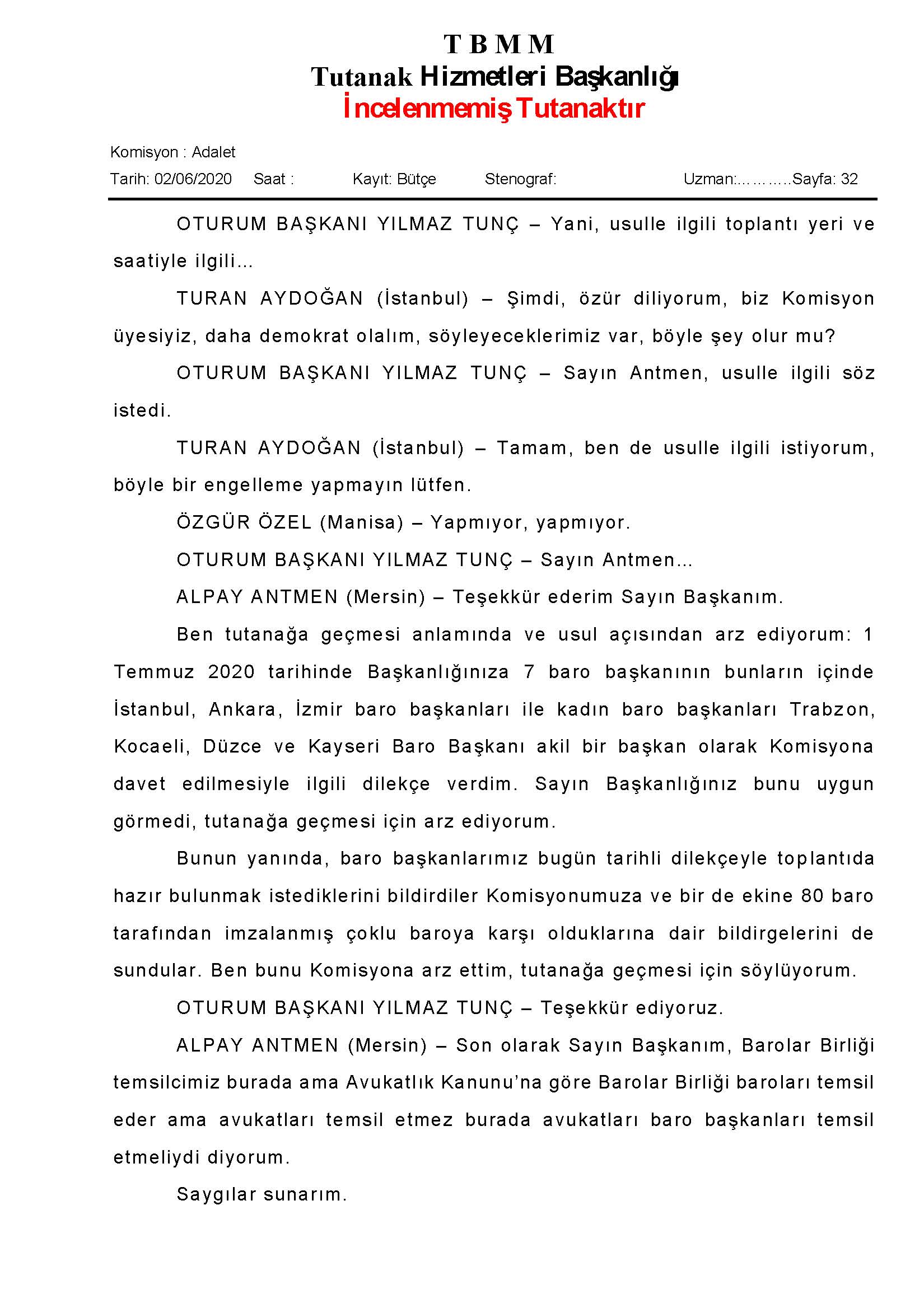 “ALPAY ANTMEN (Mersin) – Teşekkür ederim Sayın Başkanım. Ben tutanağa geçmesi anlamında ve usul açısından arz ediyorum: 1 Temmuz 2020 tarihinde Başkanlığınıza 7 baro başkanının bunların içinde İstanbul, Ankara, İzmir baro başkanları ile kadın baro başkanları Trabzon, Kocaeli, Düzce ve Kayseri Baro Başkanı akil bir başkan olarak Komisyona davet edilmesiyle ilgili dilekçe verdim. Sayın Başkanlığınız bunu uygun görmedi, tutanağa geçmesi için arz ediyorum. Bunun yanında, baro başkanlarımız bugün tarihli dilekçeyle toplantıda hazır bulunmak istediklerini bildirdiler. Komisyonumuza ve bir de ekine 80 baro tarafından imzalanmış çoklu baroya karşı olduklarına dair bildirgelerini de sundular. Ben bunu Komisyona arz ettim, tutanağa geçmesi için söylüyorum.