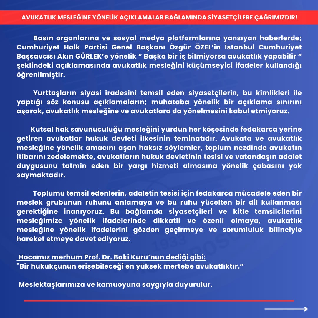 BAROLARDAN ORTAK AÇIKLAMA: AVUKATLIK MESLEĞİNE YÖNELİK AÇIKLAMALAR BAĞLAMINDA SİYASETÇİLERE ÇAĞRIMIZDIR!