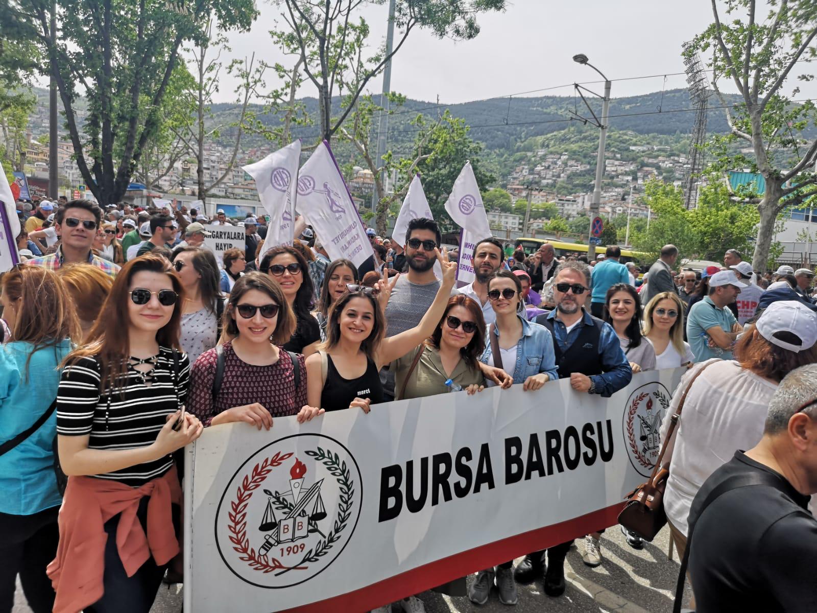 Bursa'da sivil toplum örgütleri ve sendikalar tarafından organize edilen 1 Mayıs Emek ve Dayanışma Günü yürüyüş ve mitinginde Bursa Barosu da yerini aldı. Bursa Barosu Başkanı Av. Gürkan Altun, Başkan Yardımcısı Av. Metin Öztosun, Sayman Av. Aslı Evke Yetkin, yönetim kurulu üyeleri Av. Hulusi Tığlıoğlu, Av. İlker Yılmaz ile denetleme ve disiplin kurulu üyeleriyle, bazı komisyonların başkan ve üyeleriyle avukatların katıldığı yürüyüşte atılan sloganlarda adalet ve hukukun üstünlüğüne vurgu vardı. Atatürk Stadyumu önünden başlayan yürüyüş, kortej eşliğinde Darmstadt Caddesi üzerinden Kent Meydanı'nda sona erdi. Burada kurulan platformda yapılan konuşmalarda, çalışma yaşamının sorunları, eşitlik, adalet ve özgürlük vurgusu yapıldı.
