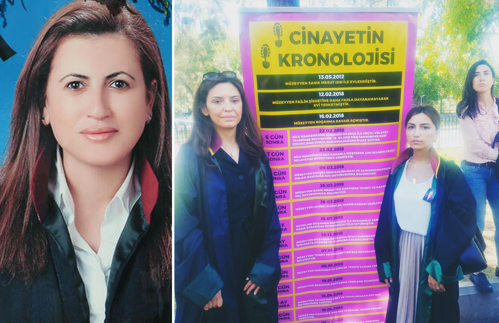 Duruşmanın görüldüğü Diyarbakır Adliyesi bahçesinde Diyarbakır Barosu'nca hazırlanan Müzeyyen Boylu Cinayeti'nin kronolojisi sergilendi.