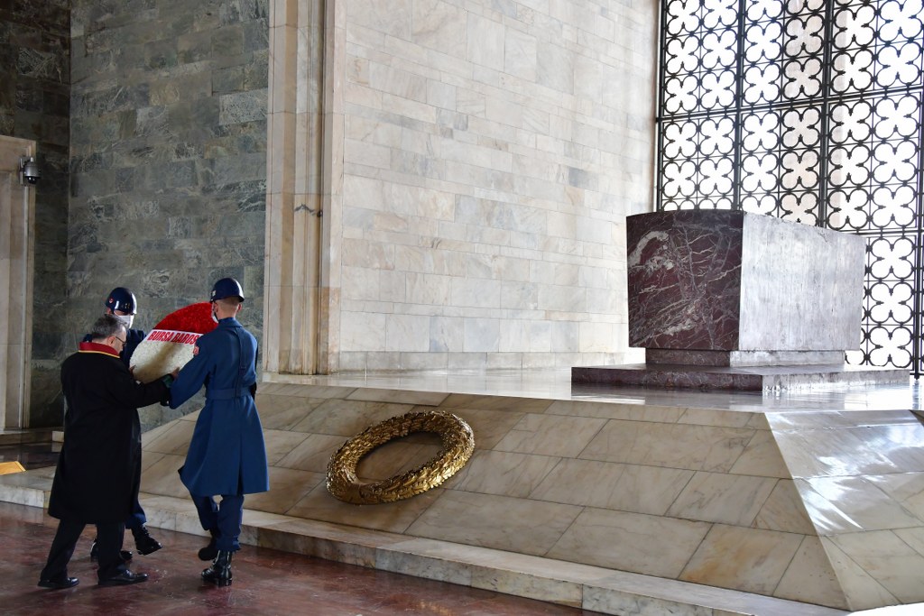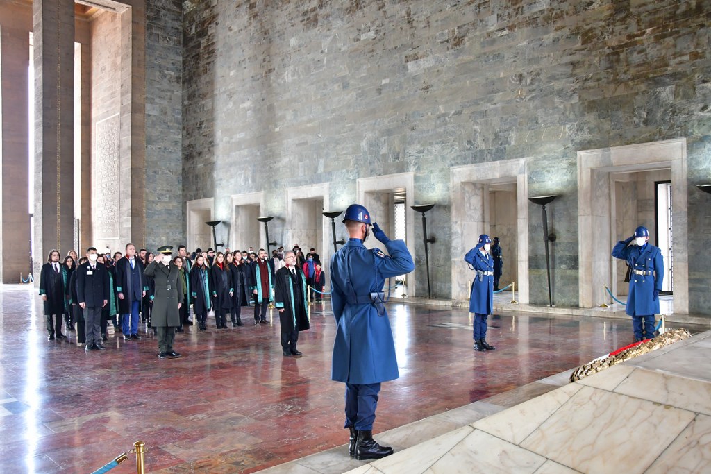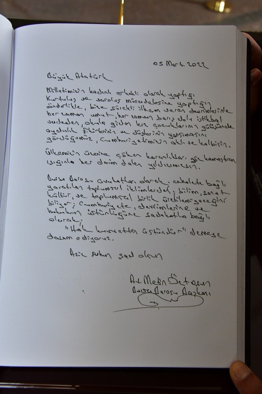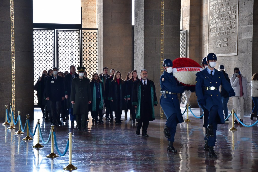 Bursa Barosu heyeti, Ankara ziyaretinin ikinci gününde Anıtkabir'de ölümsüz lider Mustafa Kemal Atatürk'ün huzurundaydı. Bursa Barosu Başkanı Av. Metin Öztosun başkanlığındaki kurul üyeleri, cübbeleriyle Aslanlı Yol'da yürüdü. Öztosun, askeri törenle Atatürk'ün mozolesine çelenk sundu. Heyet, bir dakikalık saygı duruşunun ardından Misak-ı Milli Kulesi'ne geçti. Bursa Barosu Başkanı Av. Metin Öztosun, şeref defterine şunları yazdı: