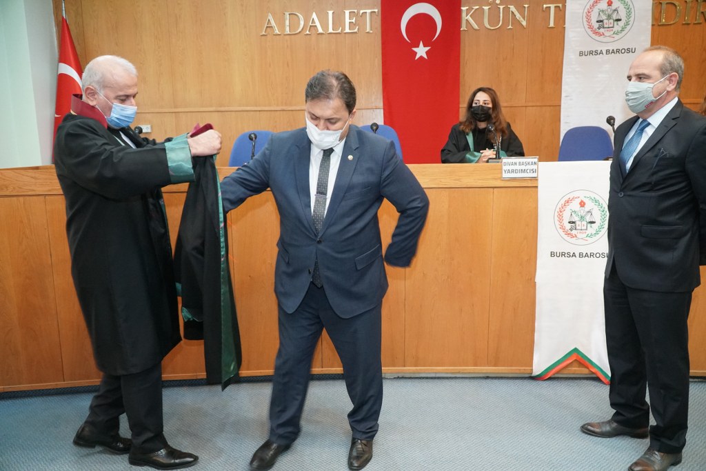 Genel Kurul Divan Başkanı Av. Şerafettin İrmiş, sunuş konuşmasının ardından Bursa Barosu Başkanlığı'na 3. kez seçilen Av. Gürkan Altun'a cübbe giydirdi. Osmangazi İlçe Seçim Kurulu'nca hazırlanan mazbatayı ise Altun'a Adli Yargı İlk Derece Mahkemesi Adalet Komisyonu Başkanı Ömer Gülmüş verdi. Genel Kurul Divan Başkanı Av. Şerafettin İrmiş için hazırlanan plaketi ise Cumhuriyet Başsavcısı Gökhan Şen verirken, törene katılamayan divan başkan yardımcısı Av. Vasim Şahin'in plaketini TBB Yönetim Kurulu Üyesi Av. Asude Şenol'un elinden İrmiş aldı. Divan heyeti üyeleri Av. Nur Yıldız ve Av. Tuğba Şentürk'ün plaketlerini ise Bursa Barosu önceki başkanları Av. İsmail Acar ve Av. Yahya Şimşek verdi.