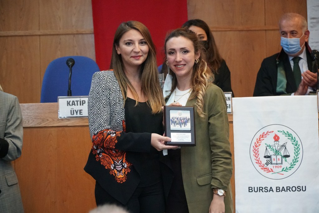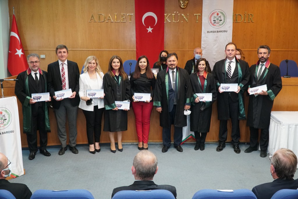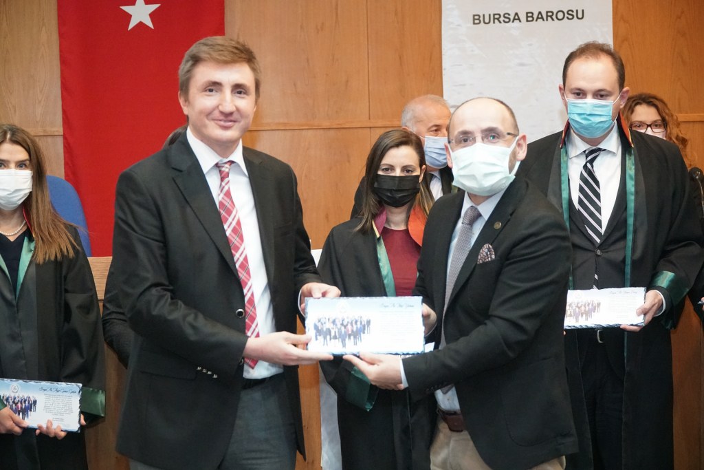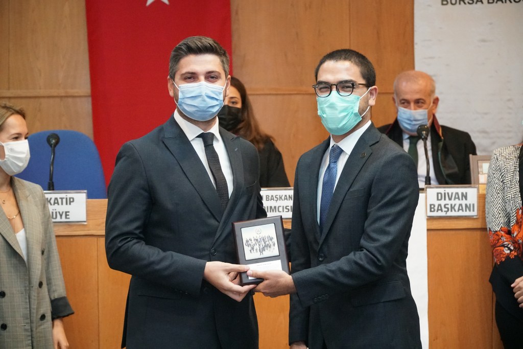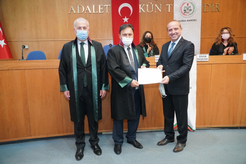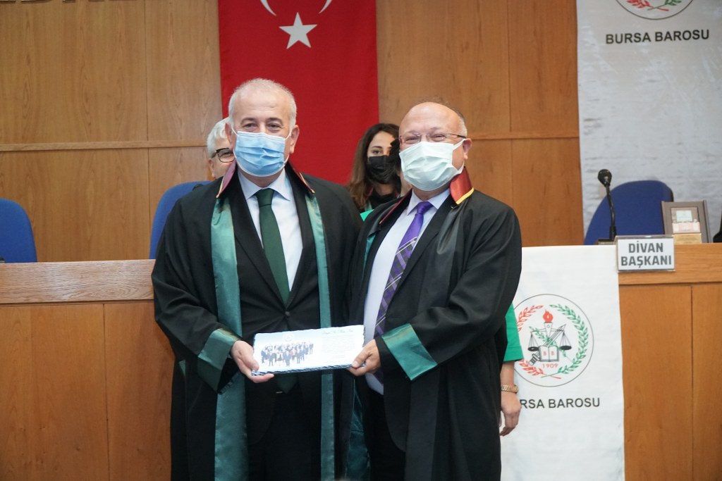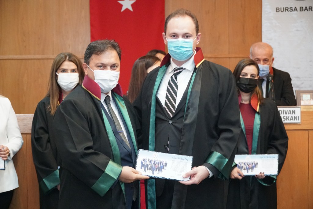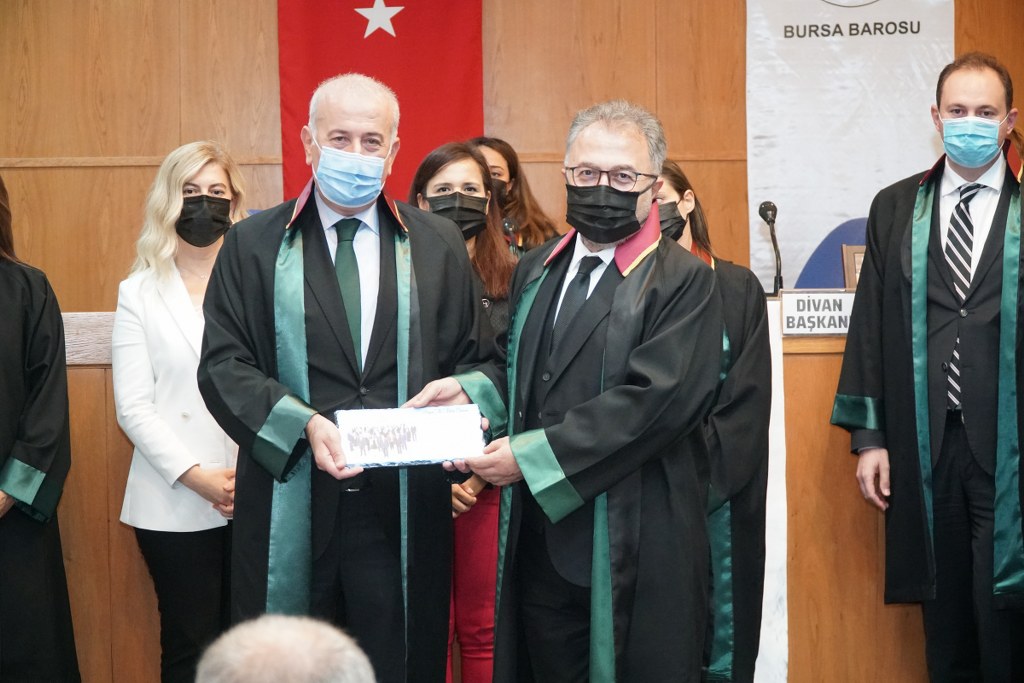 Konuşmaların ardından, yönetim, denetleme, disiplin kurullarının üyeleri ile TBB delegeleri arasında görev devir teslimi yapıldı. Önceki dönem kurul üyeleri, TBB delegeleri ve yönetim kurulu genç temsilcilerine Bursa Barosu'nca hazırlanan plaketler verildi.