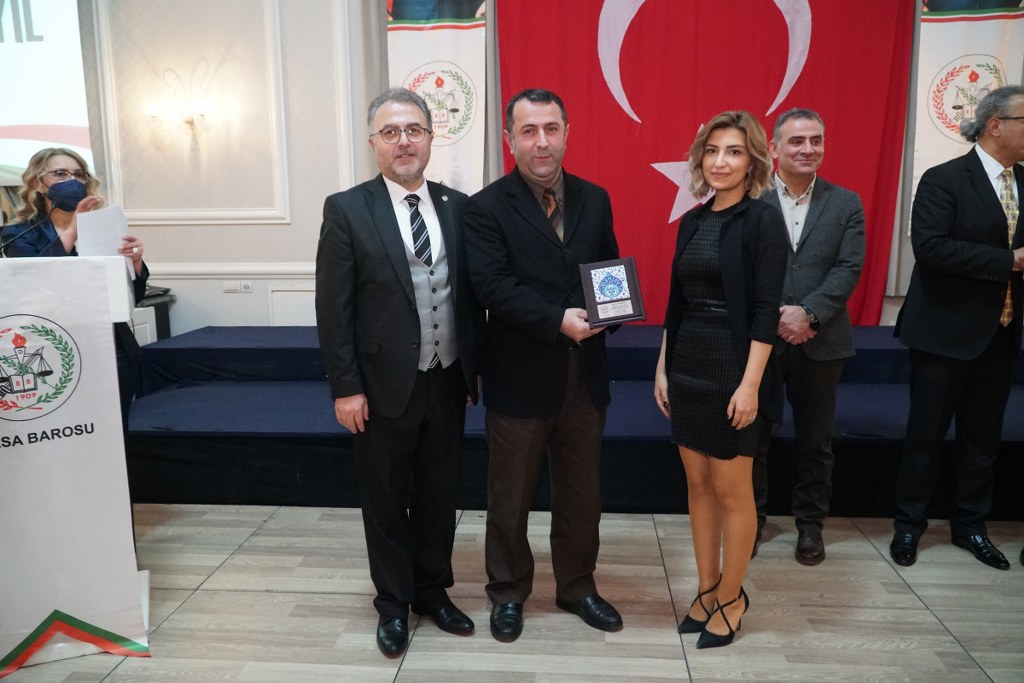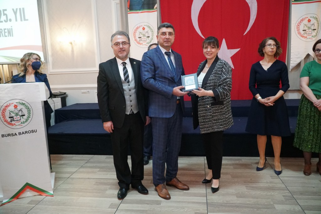 Bursa Barosu, avukatlık mesleğinde 25 yılını dolduran avukatlara plaket verdi. Podyum Davet'te düzenlenen törene, Bursa Barosu önceki başkanları Av. İsmail Hakkı Acar, Av. Ali Arabacı ve TBB Başkan Yardımcısı Av. Gürkan Altun da katıldı.