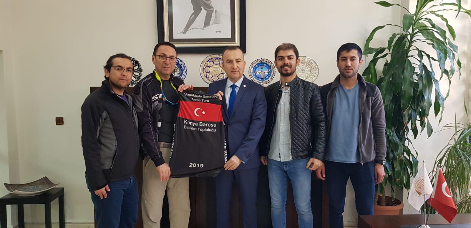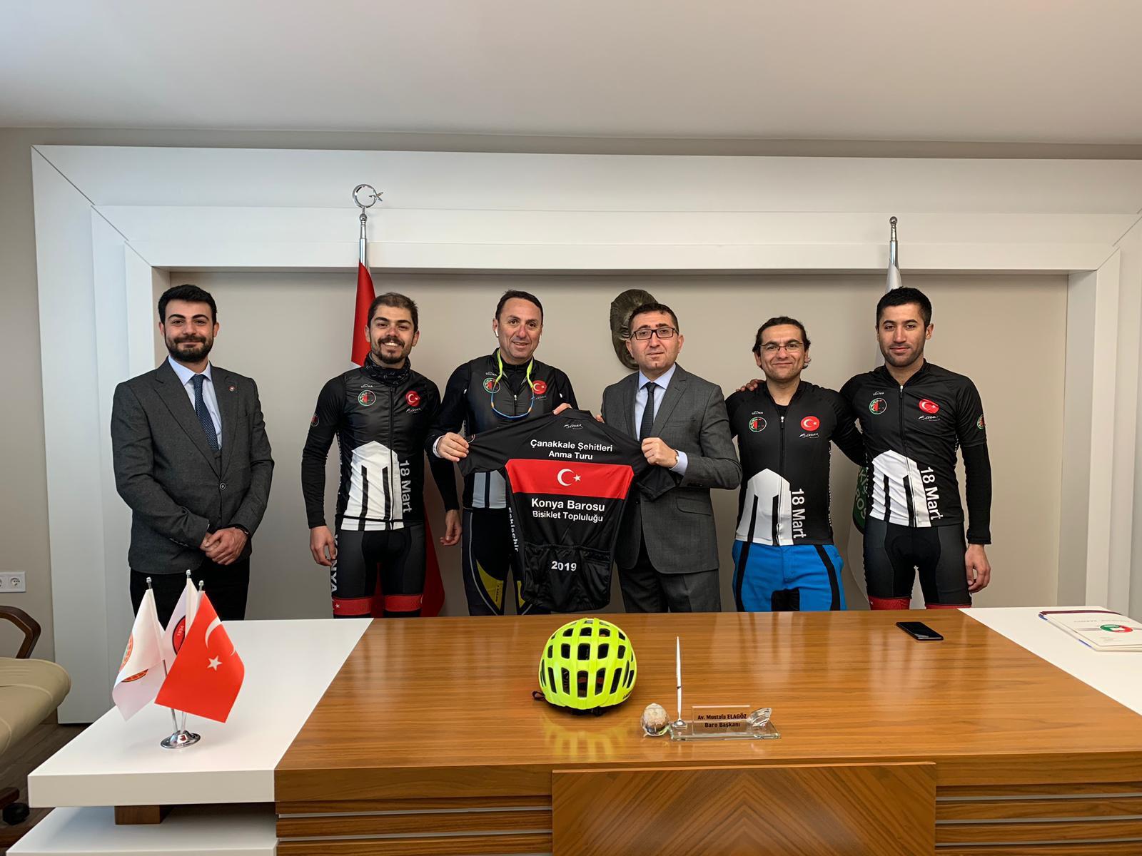 Konya Barosu Bisiklet Takımı, Çanakkale Şehitlerini Anma Bisiklet turunda Bursa Barosu'nu da ziyaret etti. Konya'dan çıkıp 7 günlük etap sonunda 18 Mart'ta Çanakkale'ye ulaşan, Av. Cengiz Yönet, Av. Muhammet Öztat, Av. İbrahim Öztürk ve Av. Mustafa Şeker'den oluşan takıma Konya Barosu personelinden Abdullah Kahraman eşlik etti. Takım geçtiği illerde baroları ziyaret etti. Afyonkarahisar Barosu Başkanı Av. Turgay Şahin, Kütahya Barosu Başkanı Av. Ahmet Atam, Eskişehir Barosu Başkanı Av. Mustafa Elagöz, Bursa Barosu Yönetim Kurulu Üyesi Av. Sefer Bülent Yaylalı ve Çanakkale Barosu Başkanı Av. Bülent Şarlan'ı ziyaret eden Konya Barosu Bisiklet Takımı, ziyaretlerde tur anısına yaptırılan formalardan hediye etti. Avukat sporcular turu, Çanakkale Şehitler Abidesi'nde noktaladı.