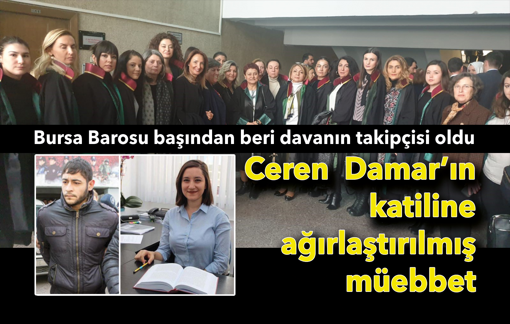 Bursa Barosu Kadın Hakları Merkezi'nin başından beri takip ettiği Ceren Damar Cinayeti Davası'nda mahkeme hüküm verdi ve katil zanlısı Hasan İsmail Hikmet'i ağırlaştırılmış müebbet hapse mahkum etti.