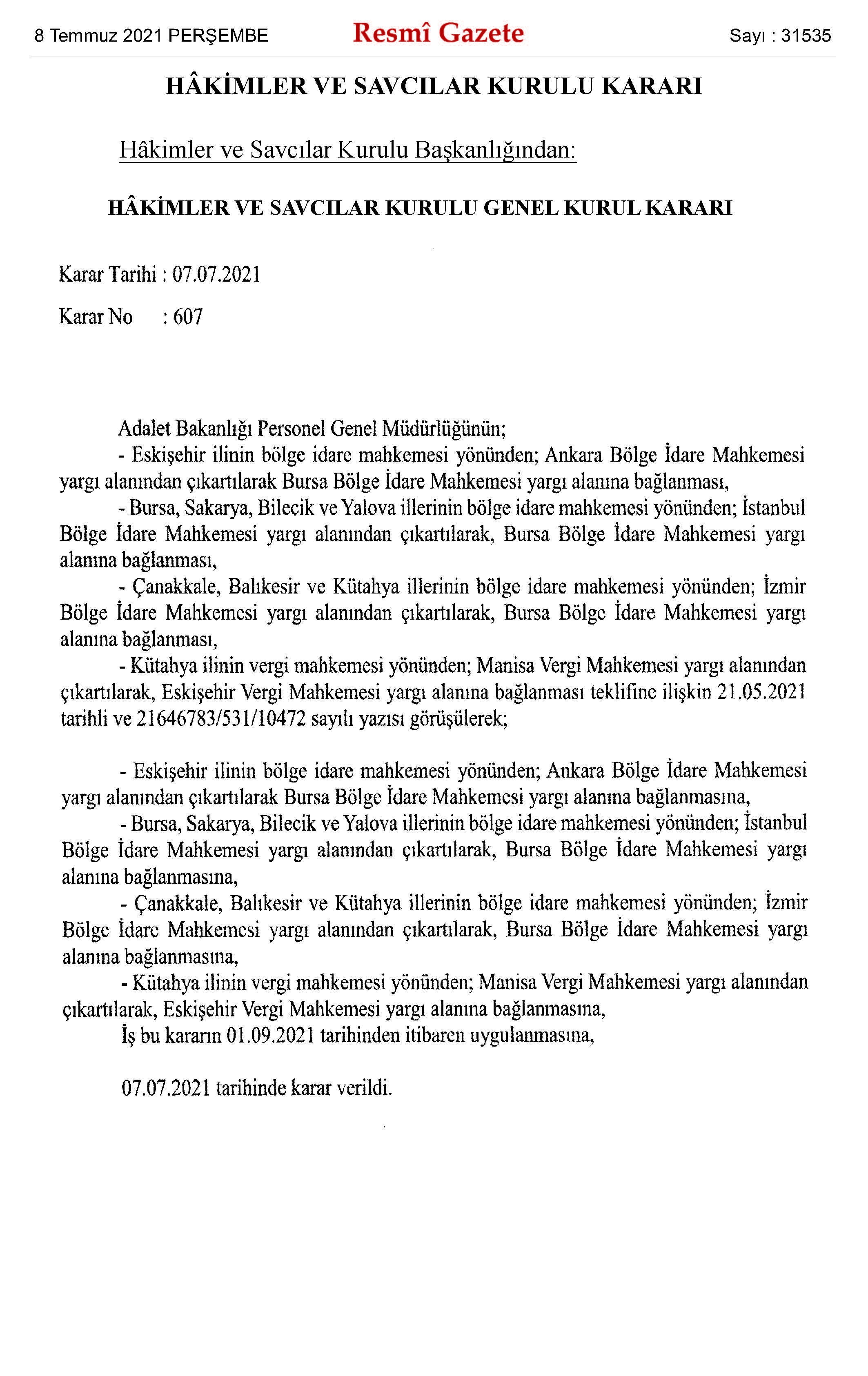 2015 yılında kurulan Çanakkale, Balıkesir, Bilecik, Kütahya, Yalova ve Eskişehir illerinin de bağlandığı Bursa Bölge İdare Mahkemesi'nin kadrosu 2016 yılında başka illere atanmış, Bursa İdare ve vergi mahkemeleri de İstanbul Bölge İdare Mahkemesi yargı çevresine dahil edilmişti. HSK'nın 7 Temmuz 2021 tarihli kararıyla Bursa Bölge İdare Mahkemesi kadrosu yeniden oluşturuldu ve - Eskişehir ilinin bölge idare mahkemesi yönünden; Ankara Bölge İdare Mahkemesi yargı alanından çıkartılarak Bursa Bölge İdare Mahkemesi yargı alanına bağlanmasına, - Bursa, Sakarya, Bilecik ve Yalova illerinin bölge idare mahkemesi yönünden; İstanbul Bölge İdare Mahkemesi yargı alanından çıkartılarak, Bursa Bölge İdare Mahkemesi yargı alanına bağlanmasına, - Çanakkale, Balıkesir ve Kütahya illerinin bölge idare mahkemesi yönünden; İzmir Bölge İdare Mahkemesi yargı alanından çıkartılarak, Bursa Bölge İdare Mahkemesi yargı alanına bağlanmasına karar verildi.