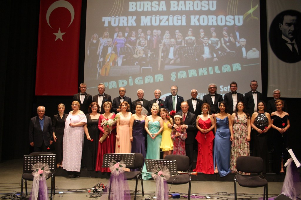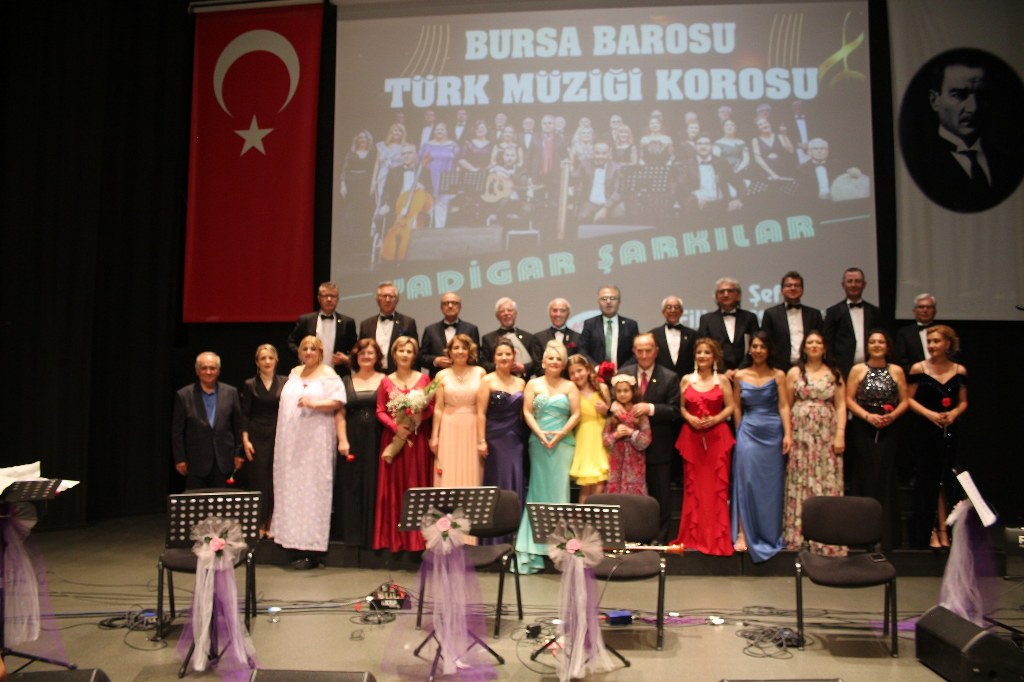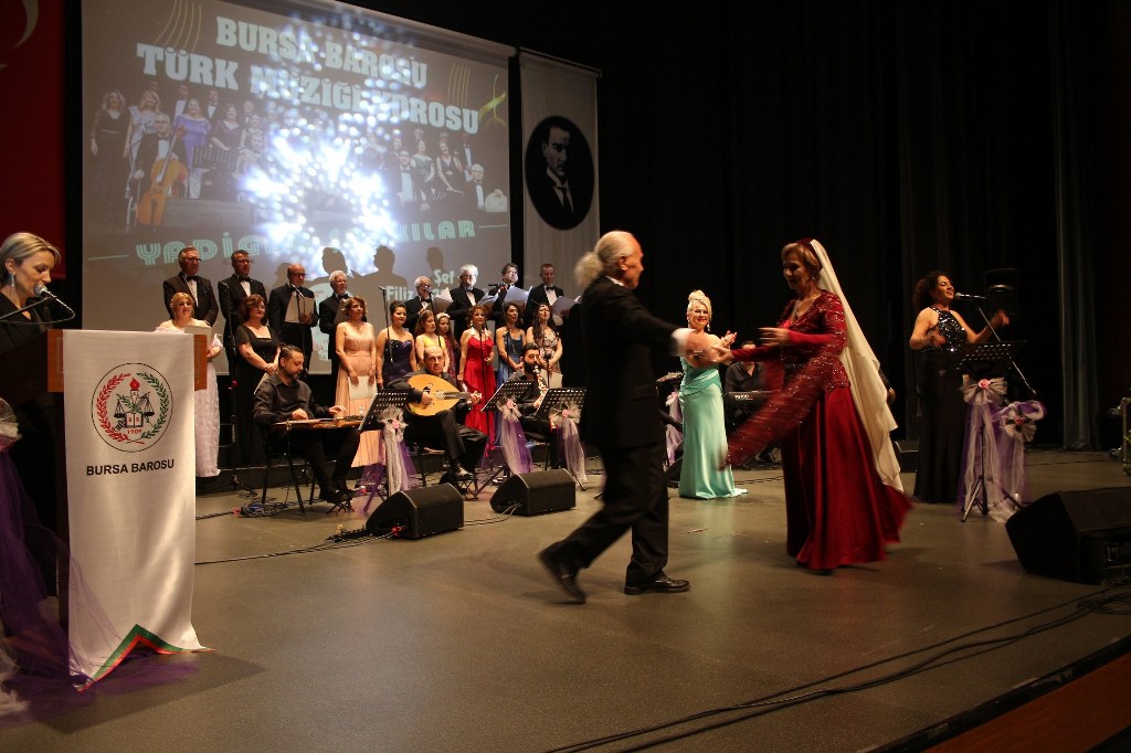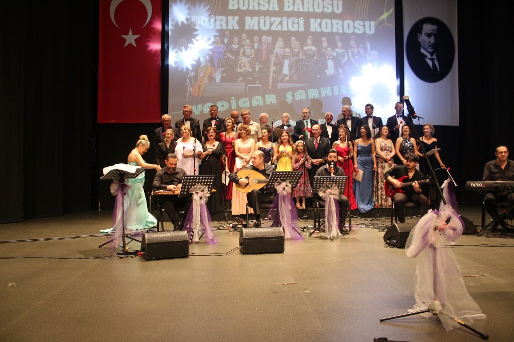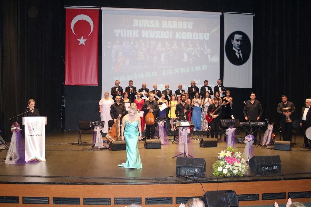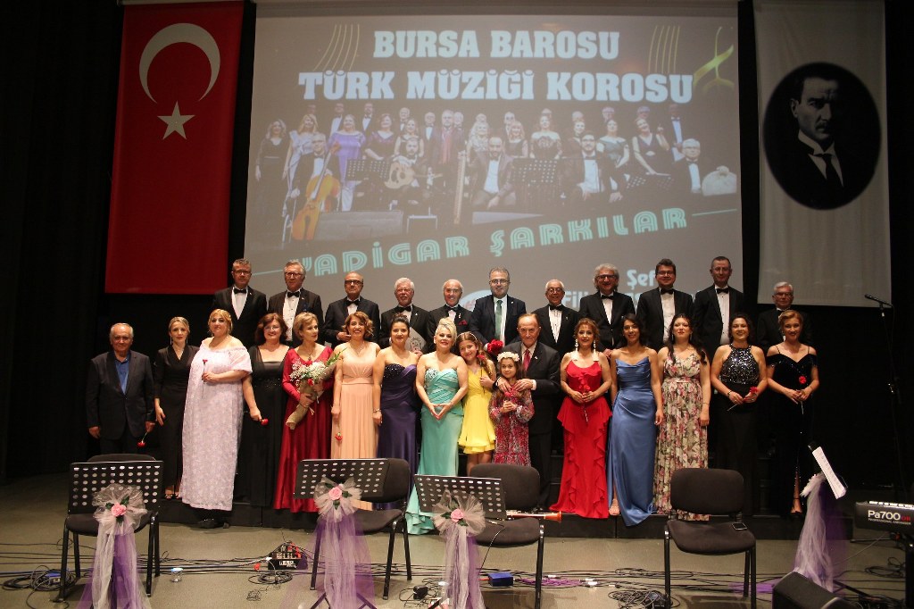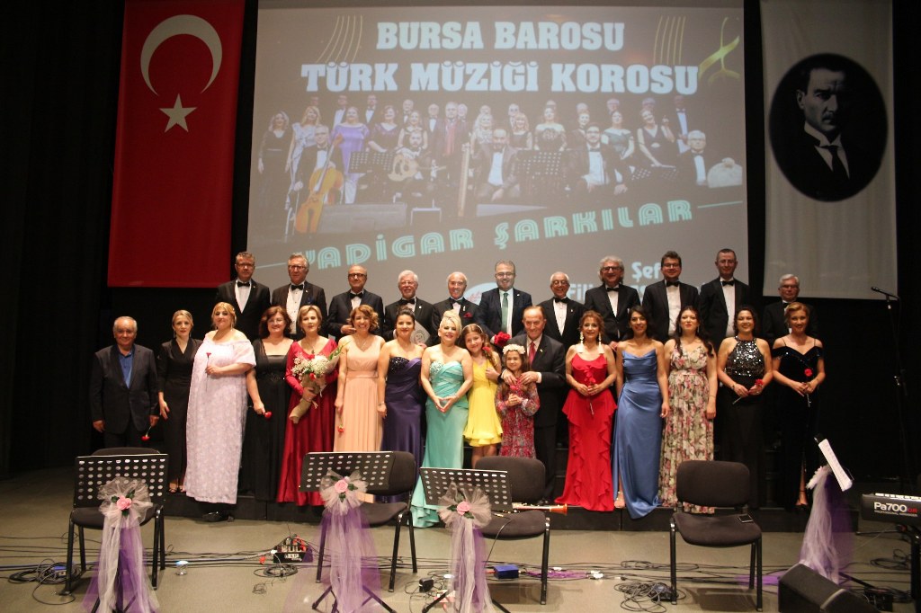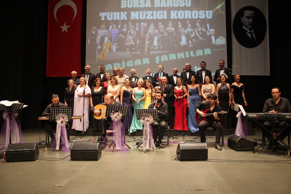 Bursa Barosu Türk Müziği Korosu'nun “Yadigar Şarkılar” konseptiyle düzenlenen konserinde izleyiciler müzikle dolu keyifli bir akşam yaşadı. BAOB Oditoryum'da gerçekleştirilen konseri, Bursa Barosu Başkanı Av. Metin Öztosun, yönetim kurulu üyeleri, Bursa Barosu önceki başkanlarından Avukat Yahya Şimşek, Devlet Sanatçısı Kutlu Payaslı, TEV Bursa Şubesi Başkanı Mehmet Çalışkan ile çok sayıda müziksever izledi. Metin Öztosun, konser sonrası Şef Filiz Başıbüyük'e teşekkür çiçeği sunarken, “Bu akşam, uzun zamandır yaşanan sıkıntılar nedeniyle şarkı dinlemeyi de, söylemeyi de unuttuğumuzu farkettim. Korist ve solist arkadaşlarım söyledikleri şarkılarla yıldız olup aktılar. Cumhuriyetimizin 100. yılını da hep birlikte coşkulu şarkılarla kutlamayı diliyorum” dedi.