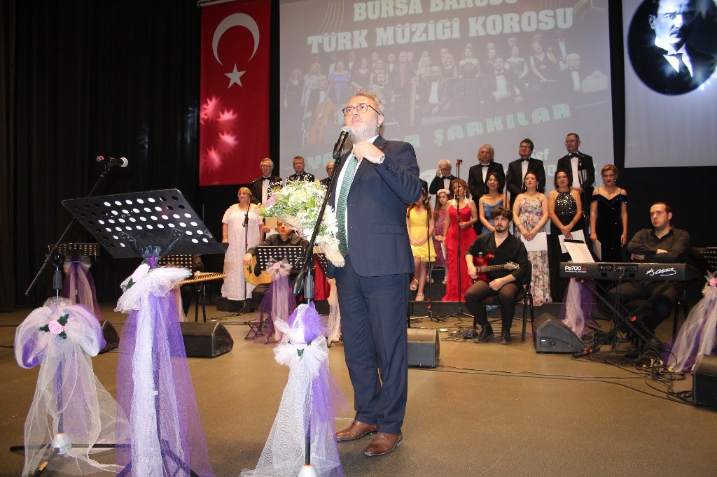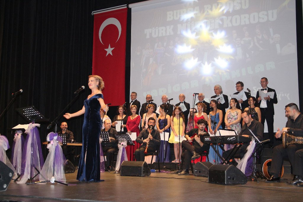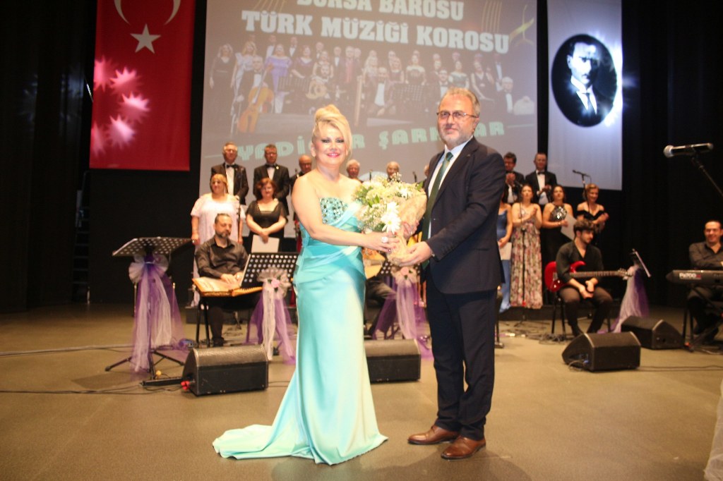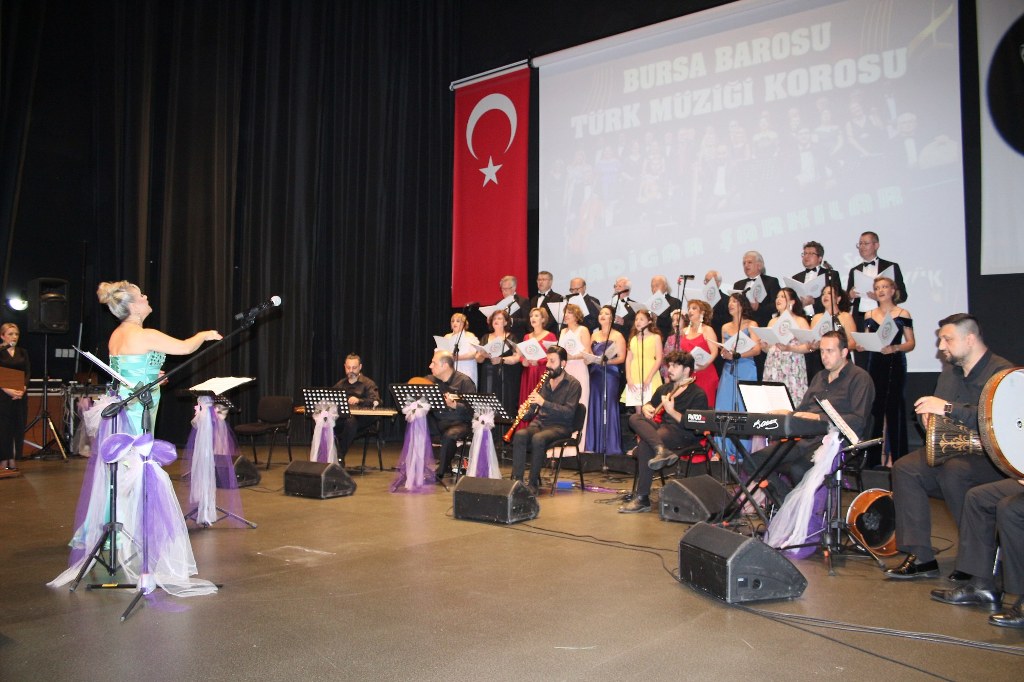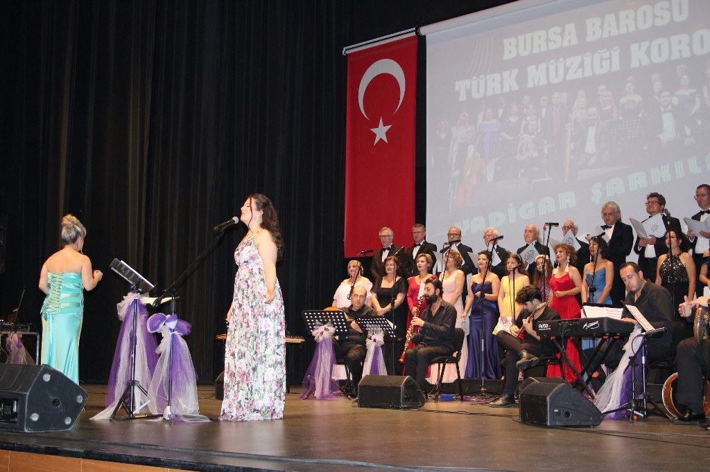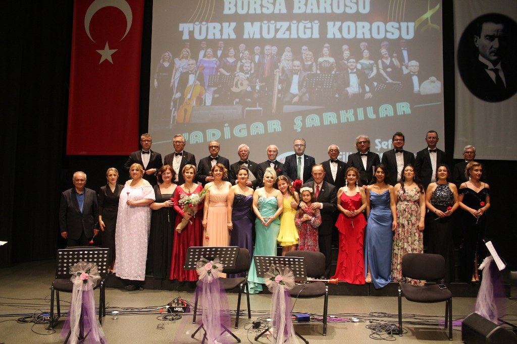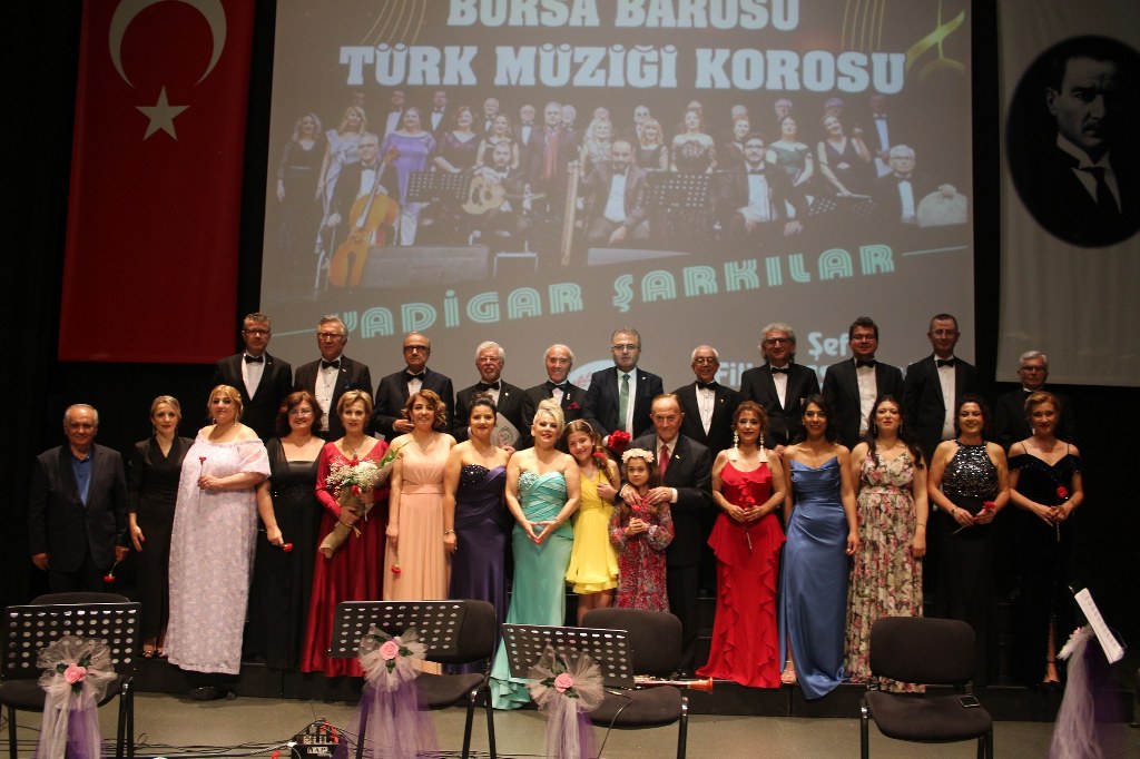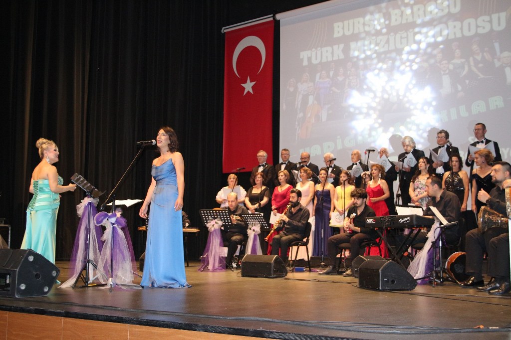 Bursa Barosu Türk Müziği Korosu'nun “Yadigar Şarkılar” konseptiyle düzenlenen konserinde izleyiciler müzikle dolu keyifli bir akşam yaşadı. BAOB Oditoryum'da gerçekleştirilen konseri, Bursa Barosu Başkanı Av. Metin Öztosun, yönetim kurulu üyeleri, Bursa Barosu önceki başkanlarından Avukat Yahya Şimşek, Devlet Sanatçısı Kutlu Payaslı, TEV Bursa Şubesi Başkanı Mehmet Çalışkan ile çok sayıda müziksever izledi. Metin Öztosun, konser sonrası Şef Filiz Başıbüyük'e teşekkür çiçeği sunarken, “Bu akşam, uzun zamandır yaşanan sıkıntılar nedeniyle şarkı dinlemeyi de, söylemeyi de unuttuğumuzu farkettim. Korist ve solist arkadaşlarım söyledikleri şarkılarla yıldız olup aktılar. Cumhuriyetimizin 100. yılını da hep birlikte coşkulu şarkılarla kutlamayı diliyorum” dedi.