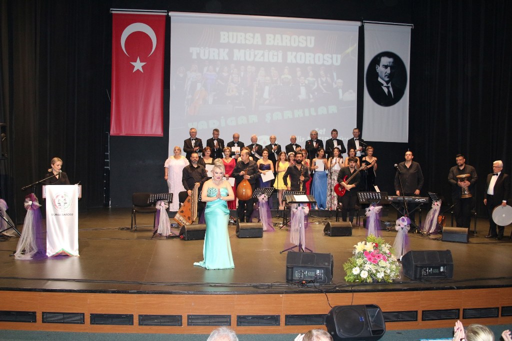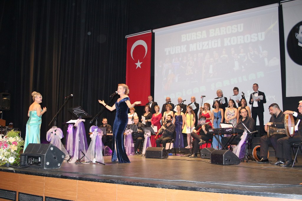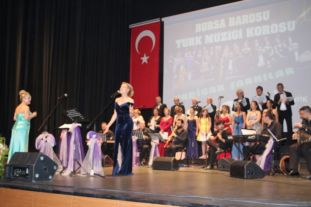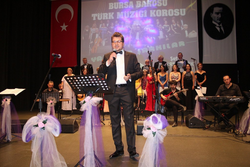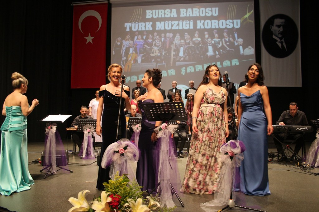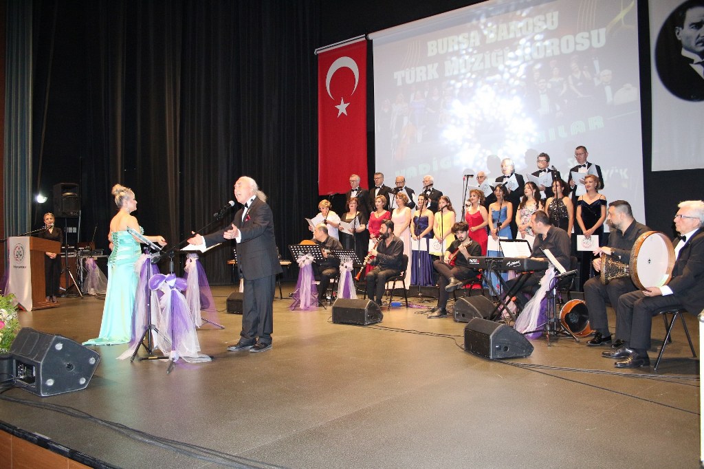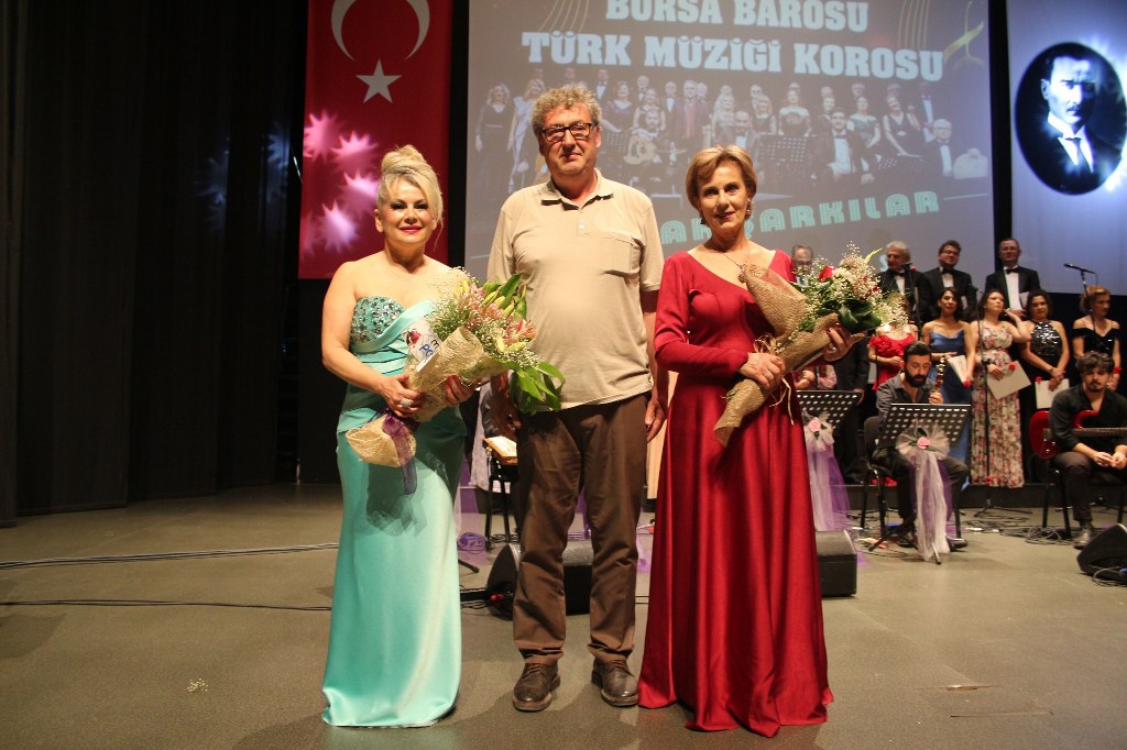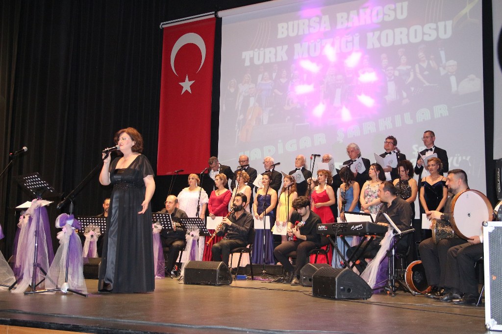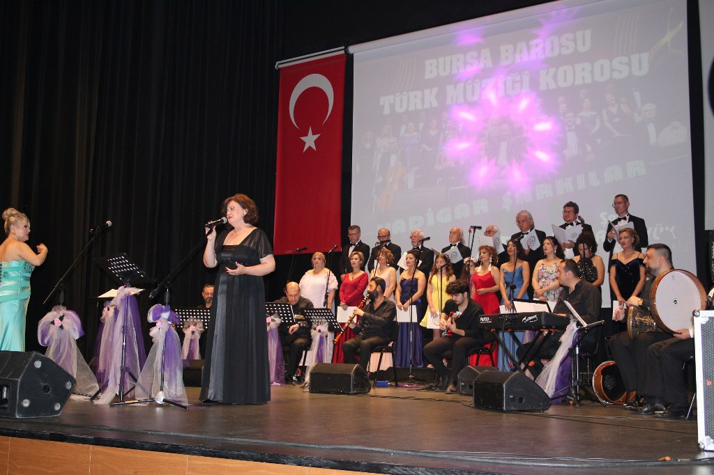 Bursa Barosu Türk Müziği Korosu'nun “Yadigar Şarkılar” konseptiyle düzenlenen konserinde izleyiciler müzikle dolu keyifli bir akşam yaşadı. BAOB Oditoryum'da gerçekleştirilen konseri, Bursa Barosu Başkanı Av. Metin Öztosun, yönetim kurulu üyeleri, Bursa Barosu önceki başkanlarından Avukat Yahya Şimşek, Devlet Sanatçısı Kutlu Payaslı, TEV Bursa Şubesi Başkanı Mehmet Çalışkan ile çok sayıda müziksever izledi. Metin Öztosun, konser sonrası Şef Filiz Başıbüyük'e teşekkür çiçeği sunarken, “Bu akşam, uzun zamandır yaşanan sıkıntılar nedeniyle şarkı dinlemeyi de, söylemeyi de unuttuğumuzu farkettim. Korist ve solist arkadaşlarım söyledikleri şarkılarla yıldız olup aktılar. Cumhuriyetimizin 100. yılını da hep birlikte coşkulu şarkılarla kutlamayı diliyorum” dedi.