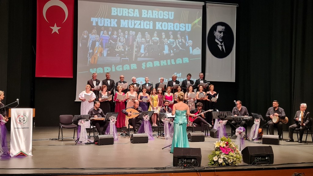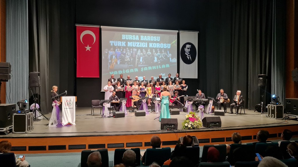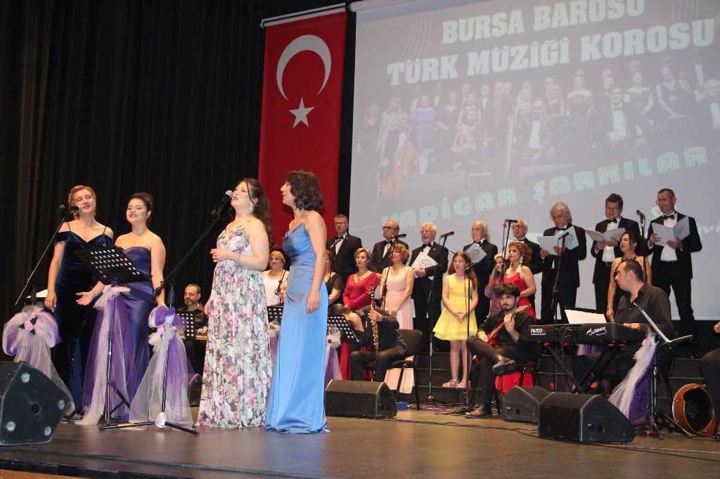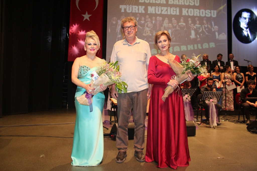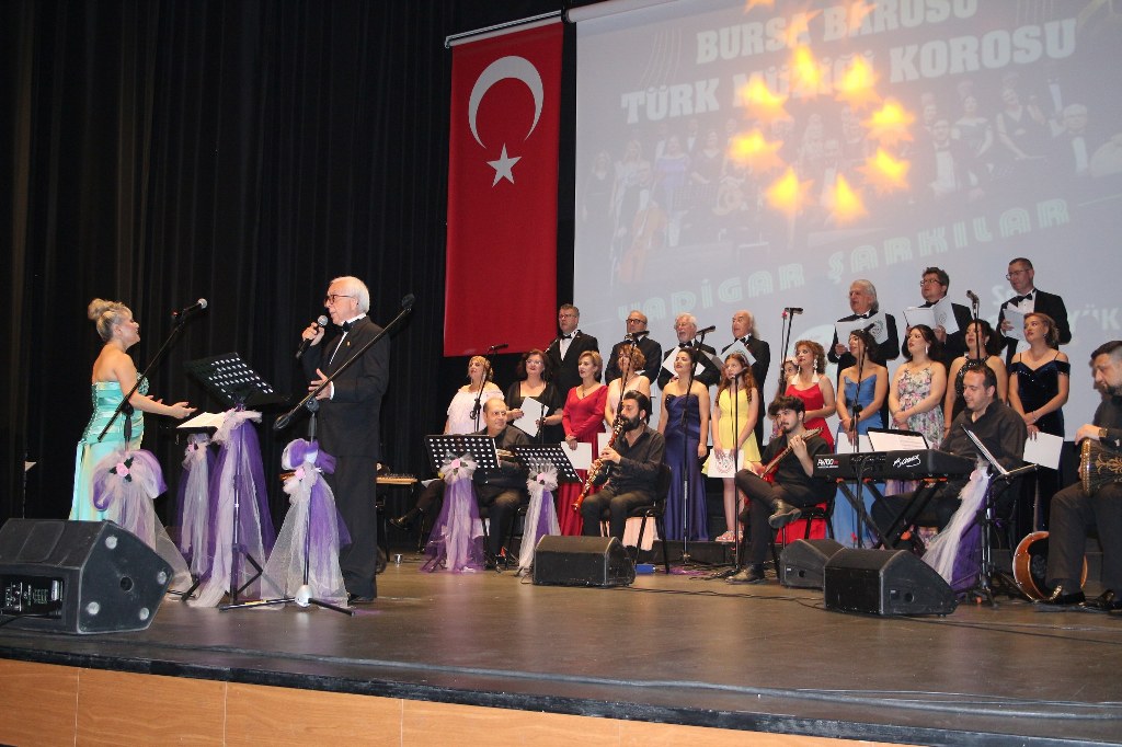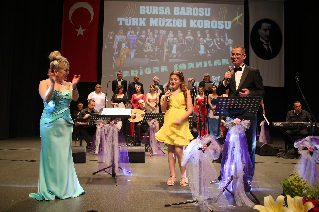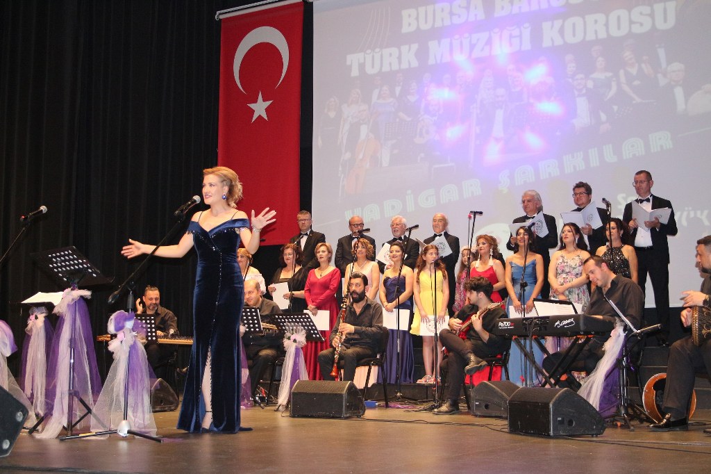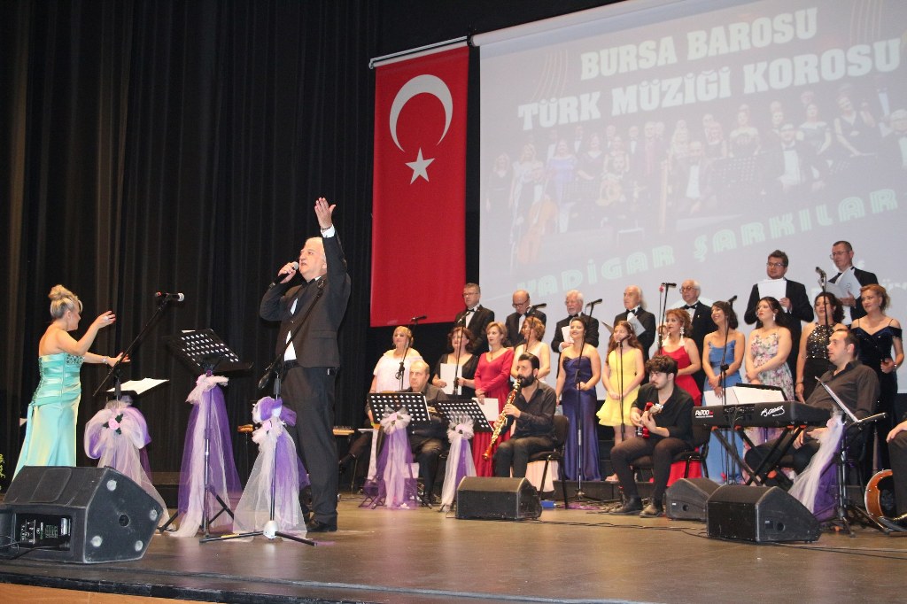 Bursa Barosu Türk Müziği Korosu'nun “Yadigar Şarkılar” konseptiyle düzenlenen konserinde izleyiciler müzikle dolu keyifli bir akşam yaşadı. BAOB Oditoryum'da gerçekleştirilen konseri, Bursa Barosu Başkanı Av. Metin Öztosun, yönetim kurulu üyeleri, Bursa Barosu önceki başkanlarından Avukat Yahya Şimşek, Devlet Sanatçısı Kutlu Payaslı, TEV Bursa Şubesi Başkanı Mehmet Çalışkan ile çok sayıda müziksever izledi. Metin Öztosun, konser sonrası Şef Filiz Başıbüyük'e teşekkür çiçeği sunarken, “Bu akşam, uzun zamandır yaşanan sıkıntılar nedeniyle şarkı dinlemeyi de, söylemeyi de unuttuğumuzu farkettim. Korist ve solist arkadaşlarım söyledikleri şarkılarla yıldız olup aktılar. Cumhuriyetimizin 100. yılını da hep birlikte coşkulu şarkılarla kutlamayı diliyorum” dedi.