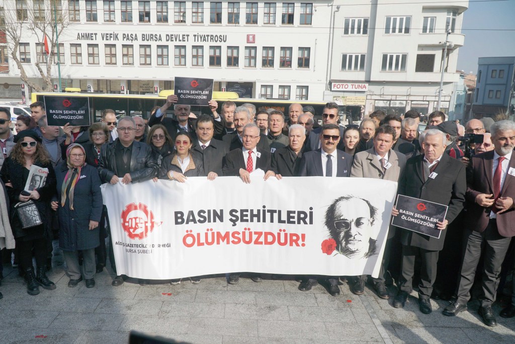 Gazeteci-Yazar, Hukukçu Uğur Mumcu, bombalı suikastle katledilişinin 32. yılında Çağdaş Gazeteciler Derneği Bursa Şubesi'nce Setbaşı'ndan Cumhuriyet Alanı'na yapılan yürüyüşle anıldı. Bursa Barosu Başkanı Av. Metin Öztosun ile avukatlar, belediye başkanları, milletvekilleri, siyasi partililer, sivil toplum örgütleri, sendikalar ile basın meslek örgütlerinin yöneticileri, üyeleri ve vatandaşların katıldığı yürüyüş sırasında diğer basın meslek şehitleri de anıldı. Atatürk Anıtı önünde saygı duruşundan sonra konuşmalar yapıldı. Bursa Barosu Başkanı Av. Metin Öztosun da katılımcılara hitap ederken, Uğur Mumcu'nun verdiği hukukun üstünlüğü, insan hakları ve demokrasi mücadelesini Bursa Barosu olarak bizler de veriyoruz. Zorlu bir mücadele bu... Siyasi partilerin varlığı tek başına demokrasinin kanıtı değildir. Düşünce ve ifade özgürlüğü, basın özgürlüğü varsa demokrasi vardır. Basın da susturulmaya, korkutulmaya çalışılıyor. Hukukun üstünlüğü bir türlü gerçekleşmiyor. Üstünlerin hukukunun oluştuğu yerde insan hakları, demokrasi, hukuk iğdiş ediliyor. 2017 yılındaki anayasa değişikliği ile başlayan süreç daha da hızlandı, halk artık boğuluyor. Uğur Mumcu'nun mücadele bayrağını hep birlikte taşımamız gerekiyor” dedi.