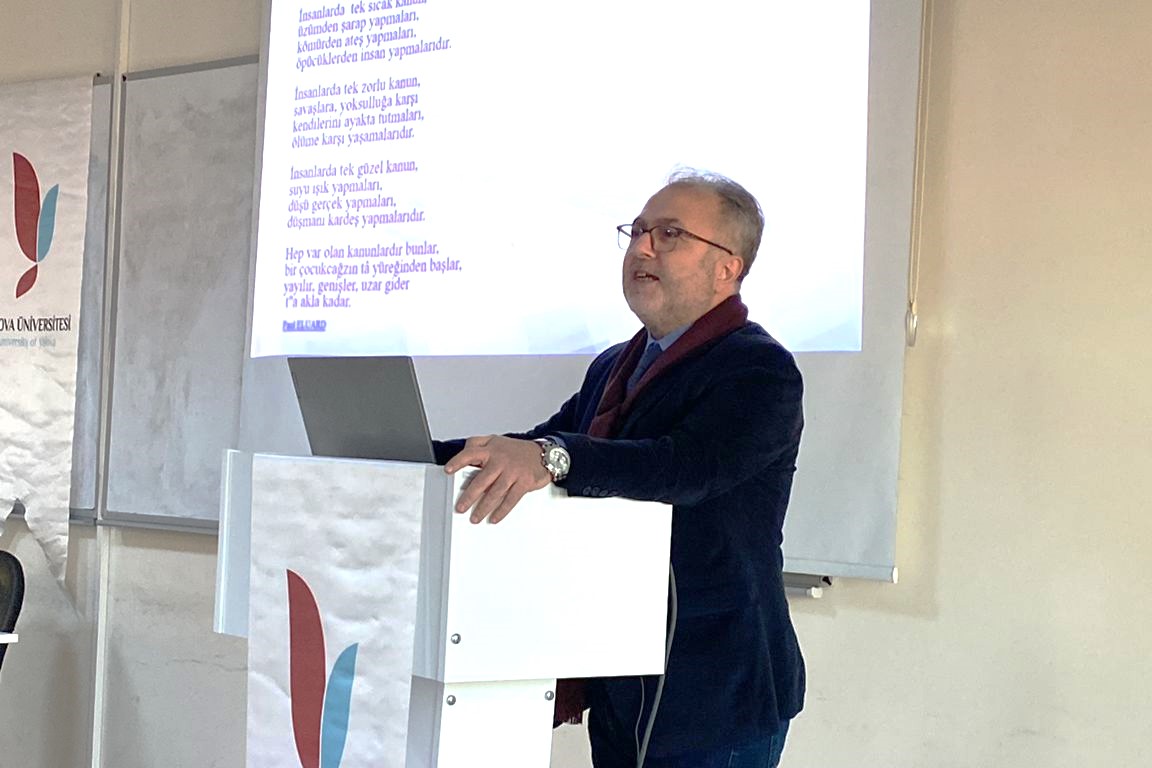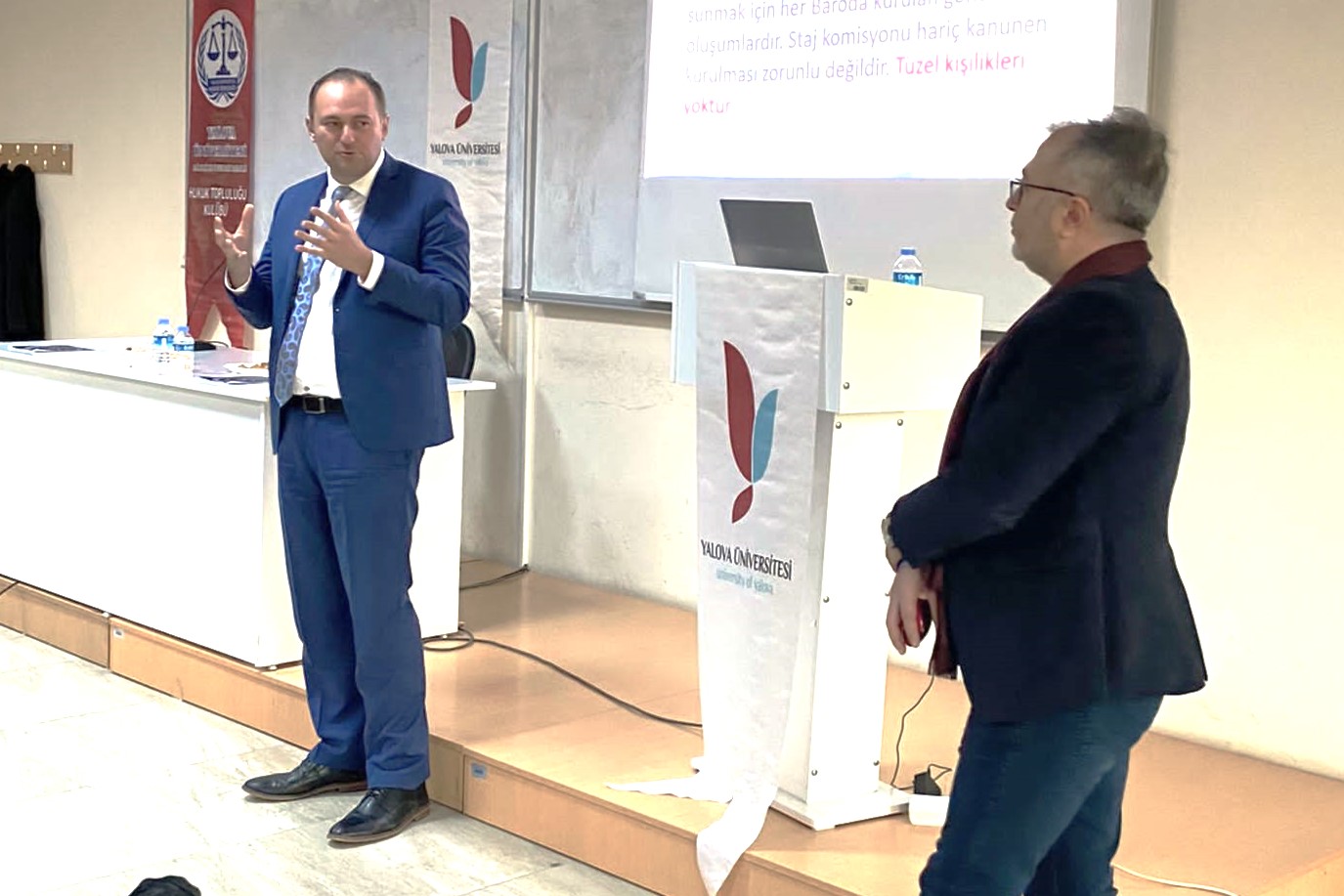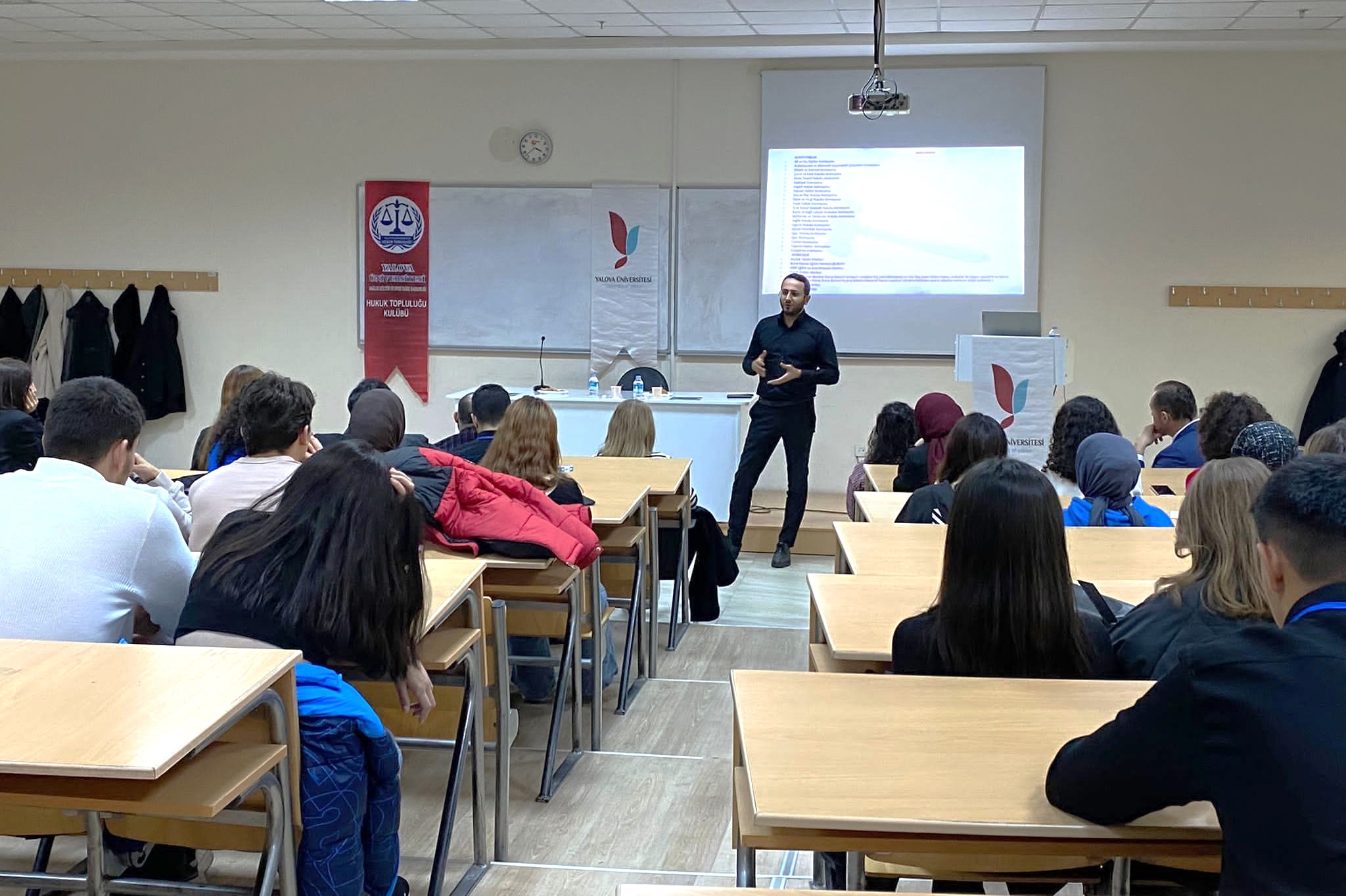 Bursa Barosu Başkanı Av. Metin Öztosun ve Genel Sekreter Av. Yener Poroy, yönetim kurulu üyesi Av. Gülender Adıgüzel Özcan, denetleme kurulu üyesi Av. Murat Özdemir ve Avukat Hakları Merkezi Başkanı Av. Ümit Özcan, Yalova Üniversitesi Hukuk Topluluğu üyesi öğrencilere avukatlık mesleğini ve baroları anlattılar.