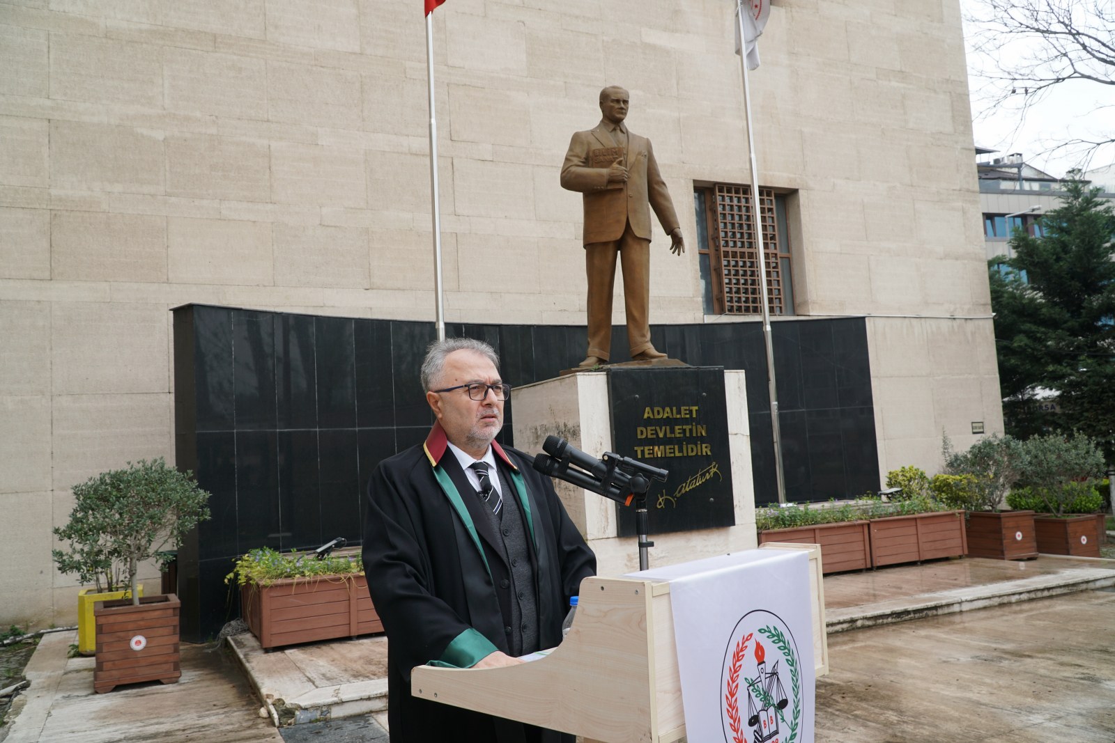 Bursa Barosu, 5 Nisan Avukatlar Günü törenini Adalet Sarayı bahçesinde gerçekleştirdi. Bursa Barosu yönetim kurulu ile diğer kurul üyeleri ve avukatların katılımıyla düzenlenen törende Bursa Barosu Başkanı Av. Metin Öztosun, yönetim kurulu genç temsilcileriyle birlikte Atatürk anıtına çelenk sundu. Bursa Büyükşehir Belediye Bandosu eşliğinde önce saygı duruşunda bulunuldu, ardından İstiklal Marşı okundu. Törene katılana meslektaşlarına ve adliye bahçesindeki yurttaşlara seslenen Öztosun'un konuşması, Türkiye'nin fotoğrafını ortaya koydu. Öztosun şöyle konuştu: