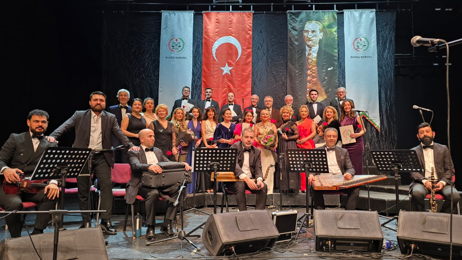 Bursa Barosu Türk Müziği Korosu, Filiz Başıbüyük şefliğinde "Mazideki Şarkılar" başlığı altındaki konserini dün akşam Tayyare Kültür Merkezi'nde verdi. Salonu dolduran izleyiciler arasında Bursa Barosu Başkanı Av. Metin Öztosun ile yönetim kurulu üyeleri de vardı. Öztosun, konser sonunda Şef Filiz Başıbüyük ile konserin sunumunu üstlenen Melahat Perihan Öztürk'e çiçek verdi. Başkan Öztosun, koro arasına katılarak son şarkıya eşlik etti.