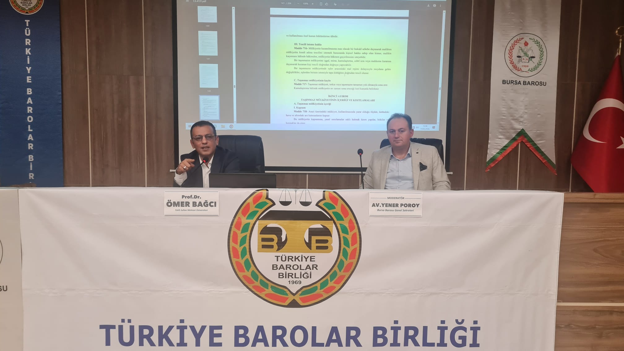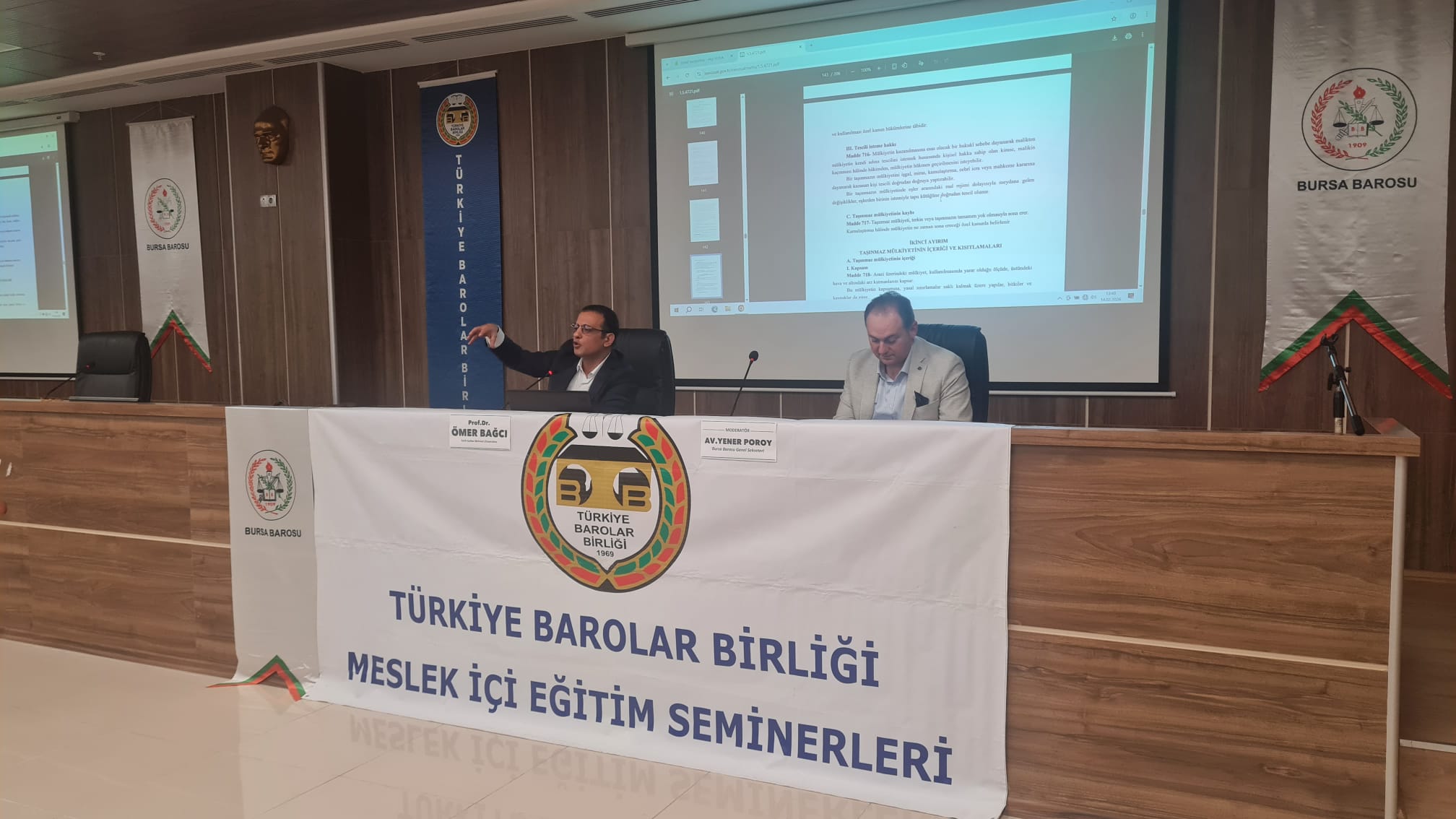 "Tapu İptal ve Tescil Davaları" konulu TBB Meslekiçi Eğitim Semineri 14 Şubat 2026 Cumartesi günü BAM Konferans Salonunda gerçekleştirildi. Fatih Sultan Mehmet Üniversitesinden Prof.Dr. Ömer Bağcı'nın konuşmacı, Bursa Barosu Genel Sekreteri Av.Yener Poroy'un Moderatörlüğünü yaptığı Eğitimi Bursa Barosu Başkanı Av. Metin Öztosun, Yönetim Kurulu Üyesi Av.Müberra Gülen Aydın ile çok sayıda Avukat/Stajyer Avukat izledi.